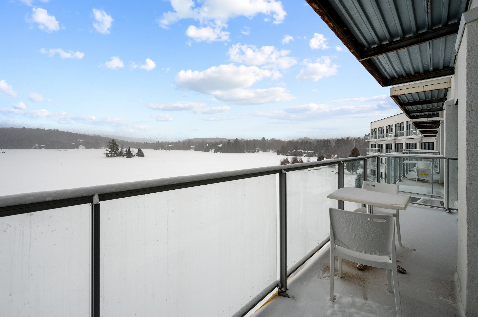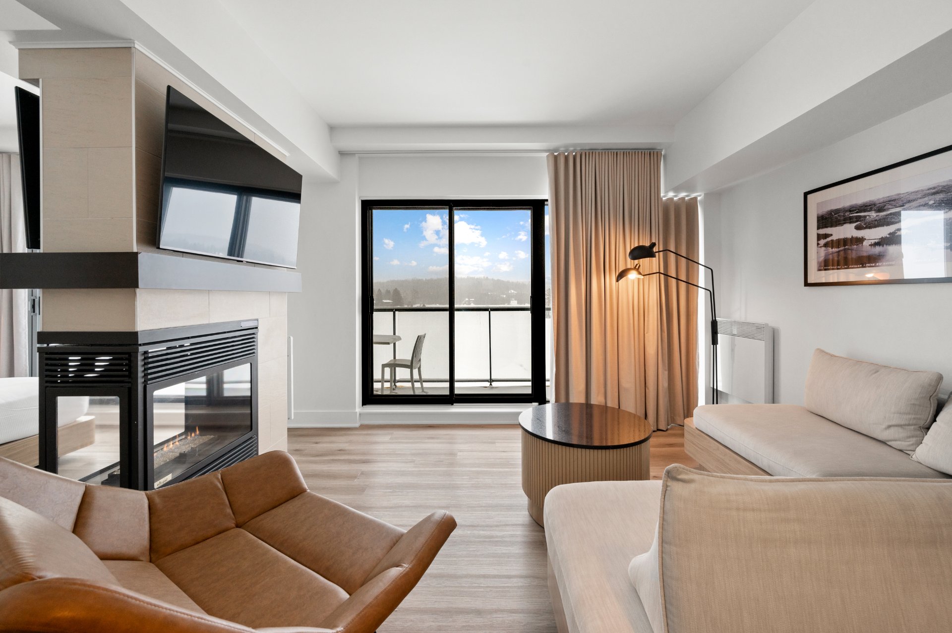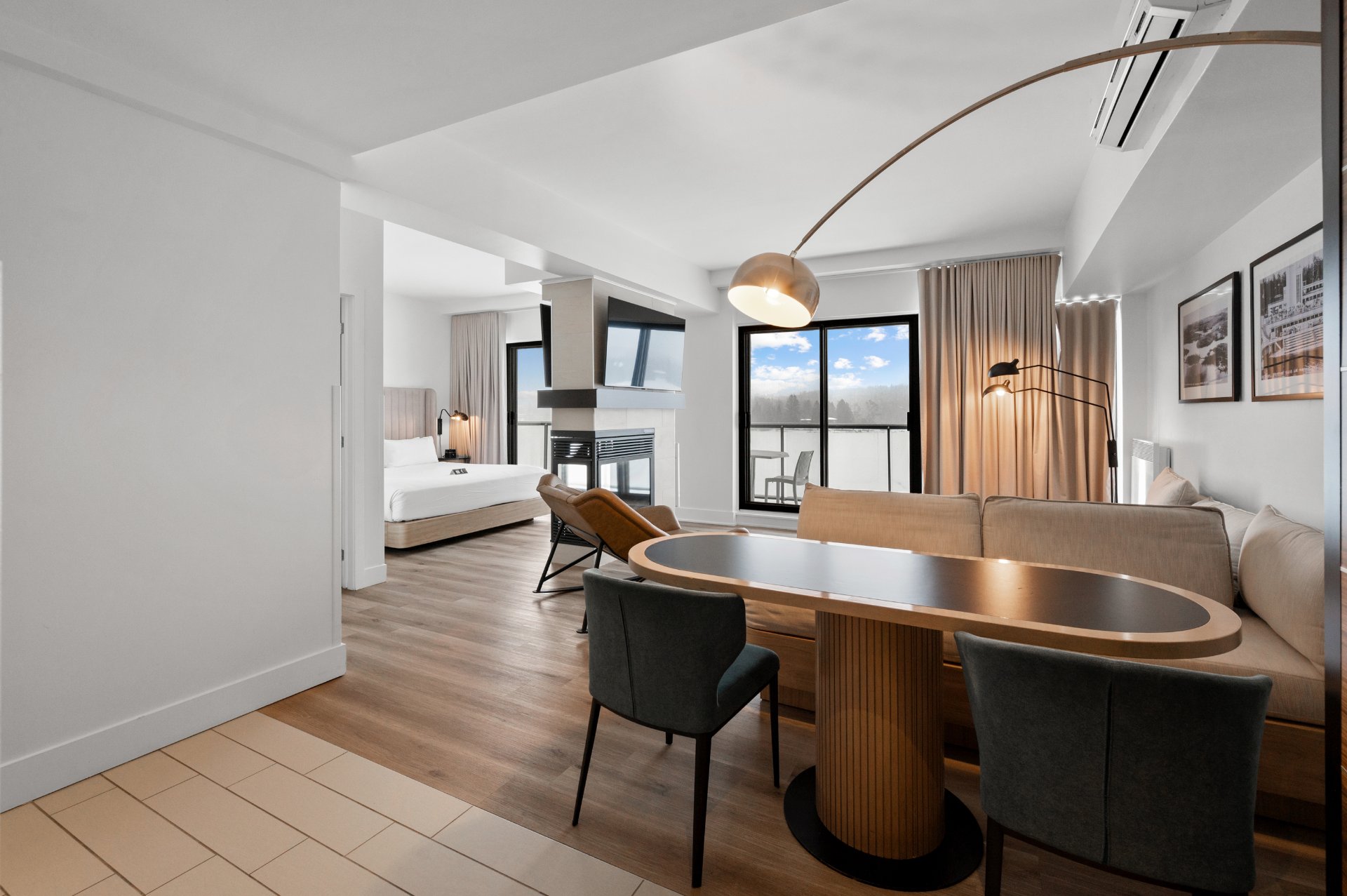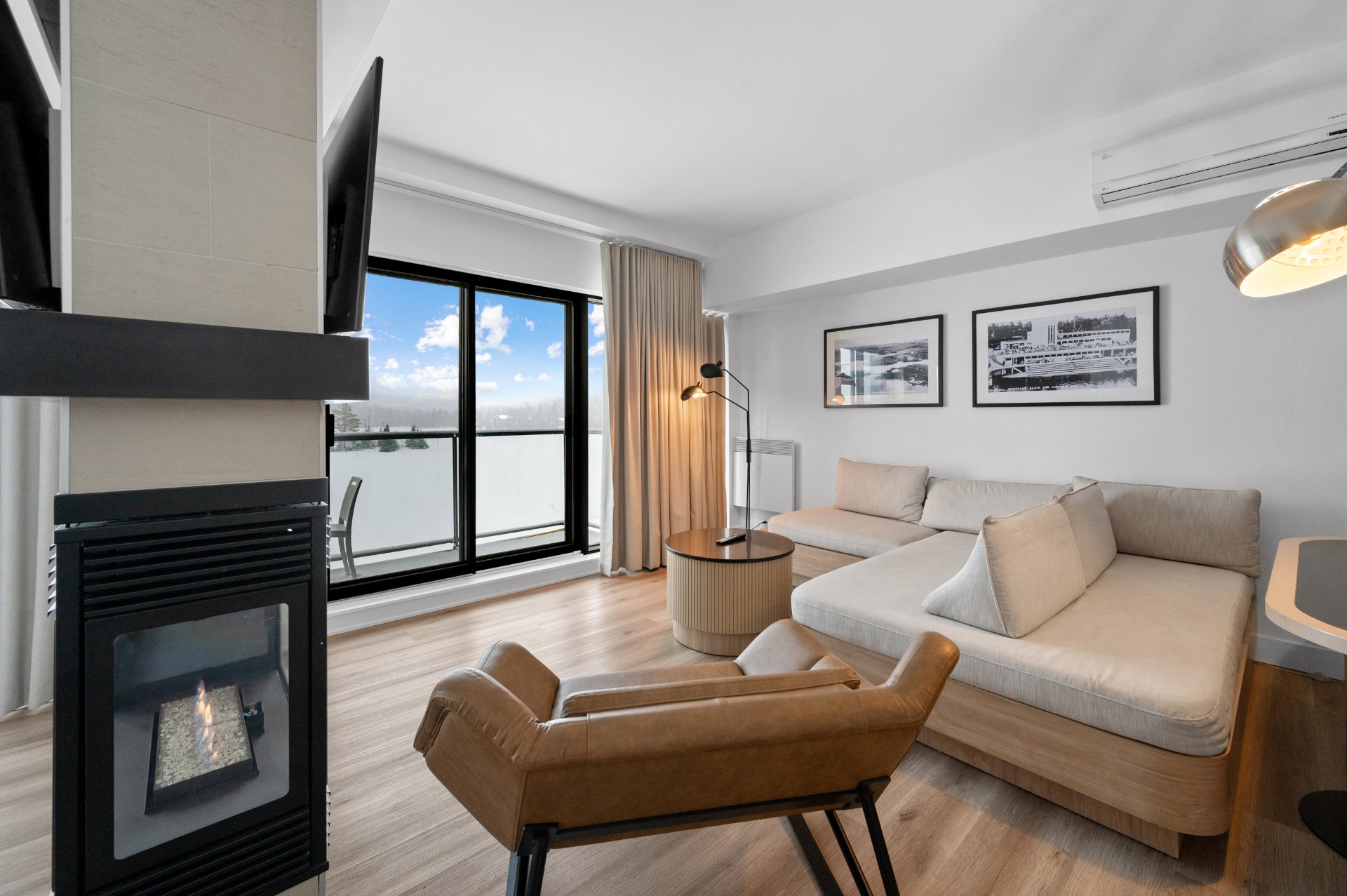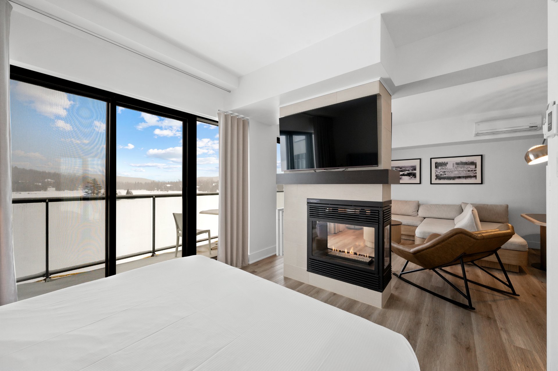 Estérel Resort - Nestled between two magnificent navigable lakes, this elegant open-plan suite offers a bedroom, a double-sided gas fireplace, a spacious bathroom, and a functional kitchenette. The glassed-in balcony allows you to enjoy the magnificent view of the lake all year round. Comfortably accommodating up to four people, this property benefits from all the amenities of the resort complex: swimming pools, spas, gym, restaurants, and more. A perfect place for a relaxing getaway or a well-considered investment in an enchanting location.
