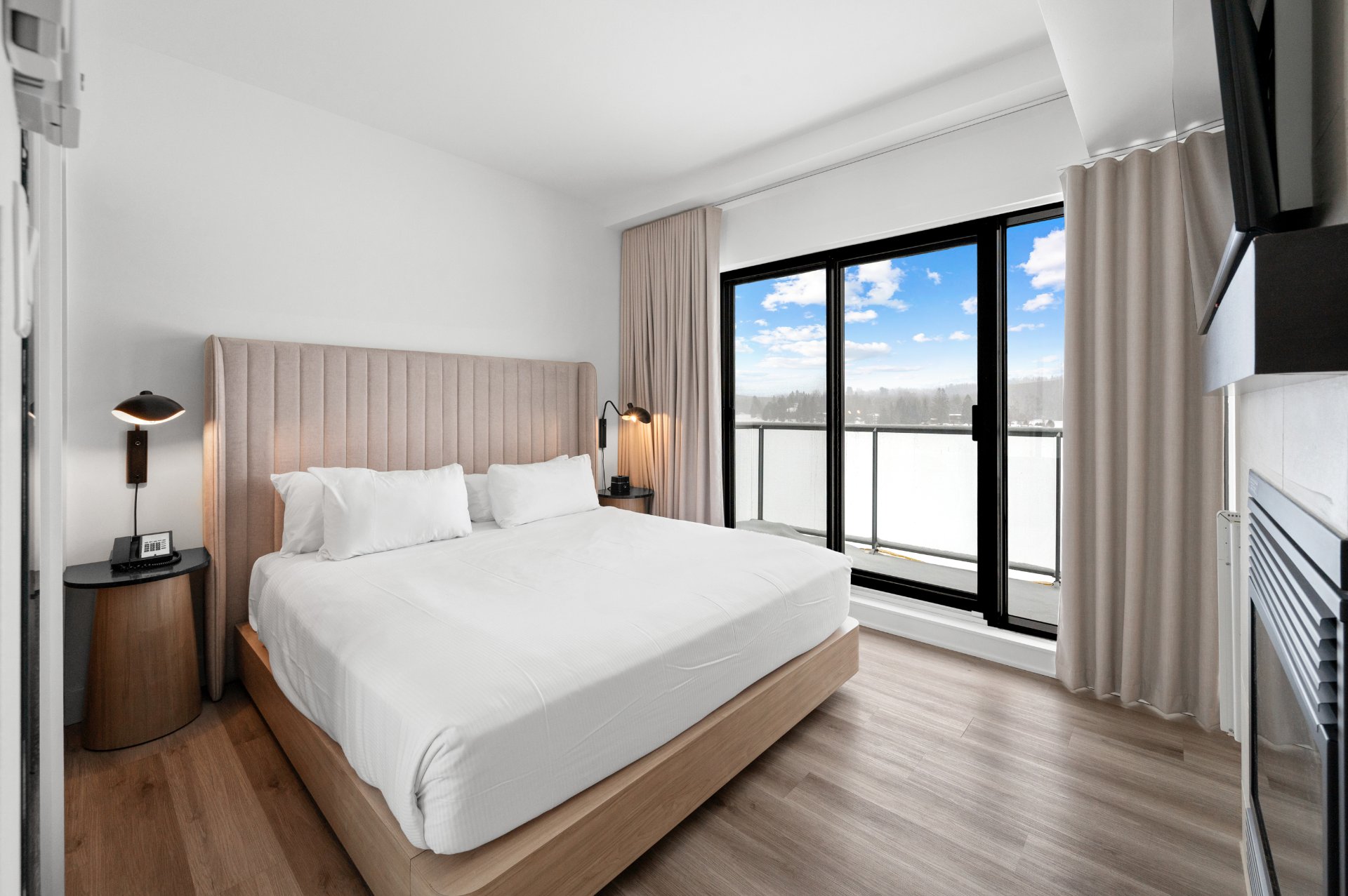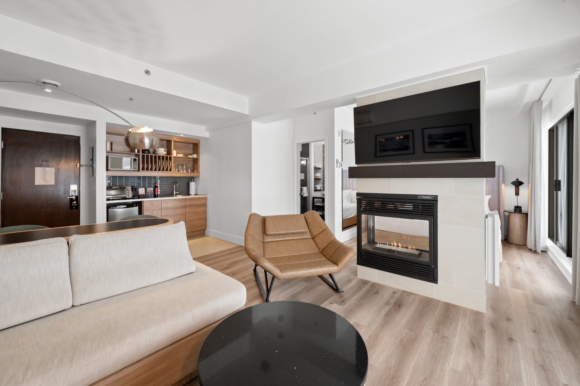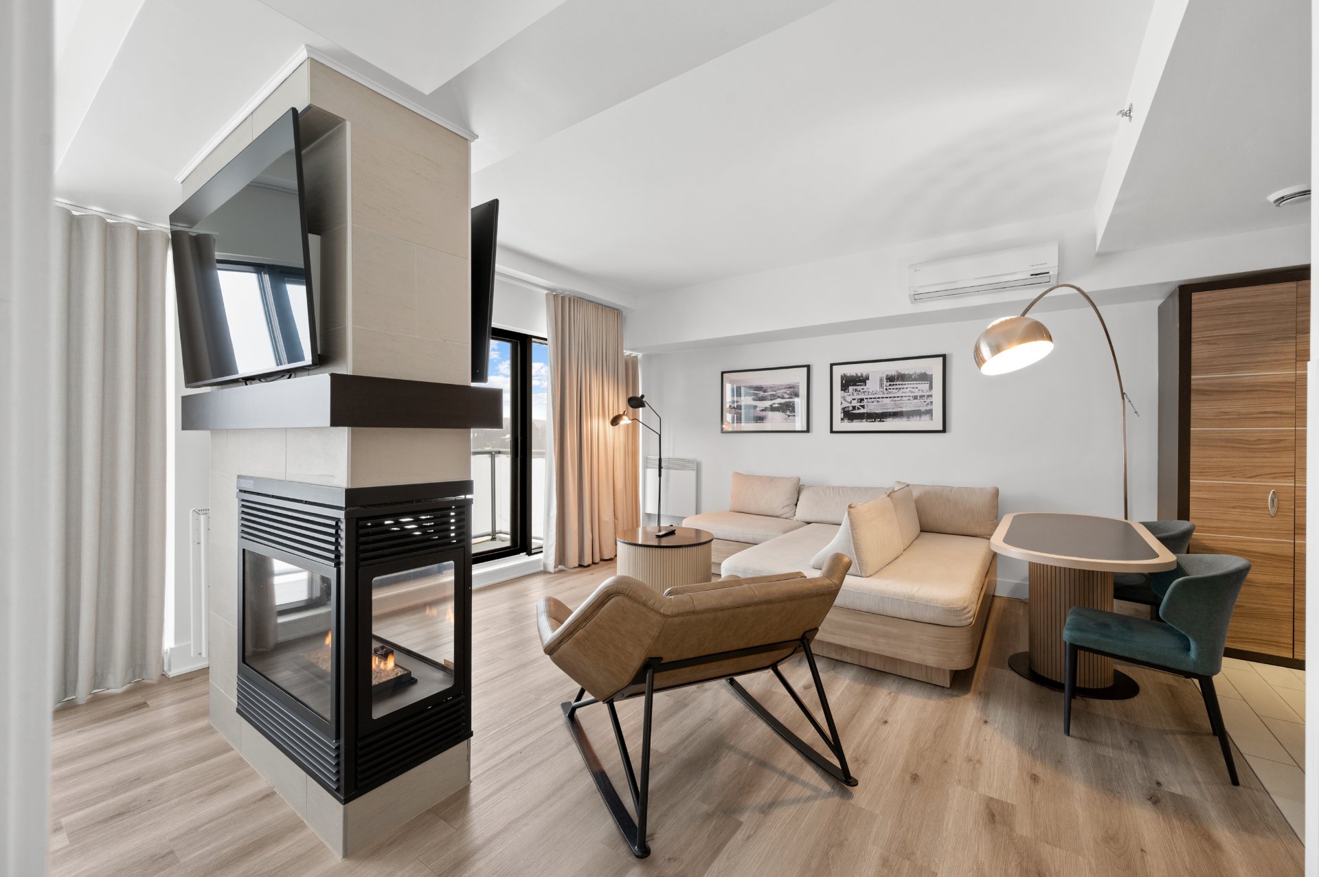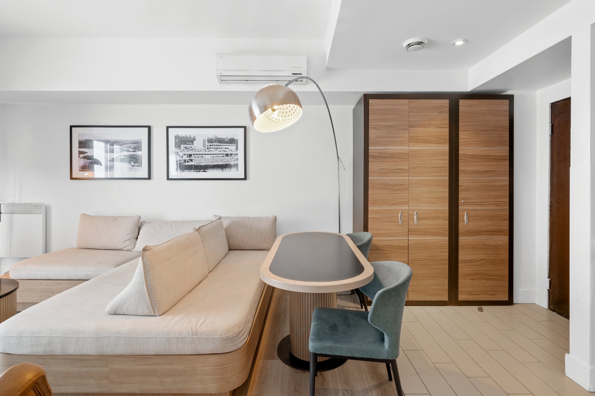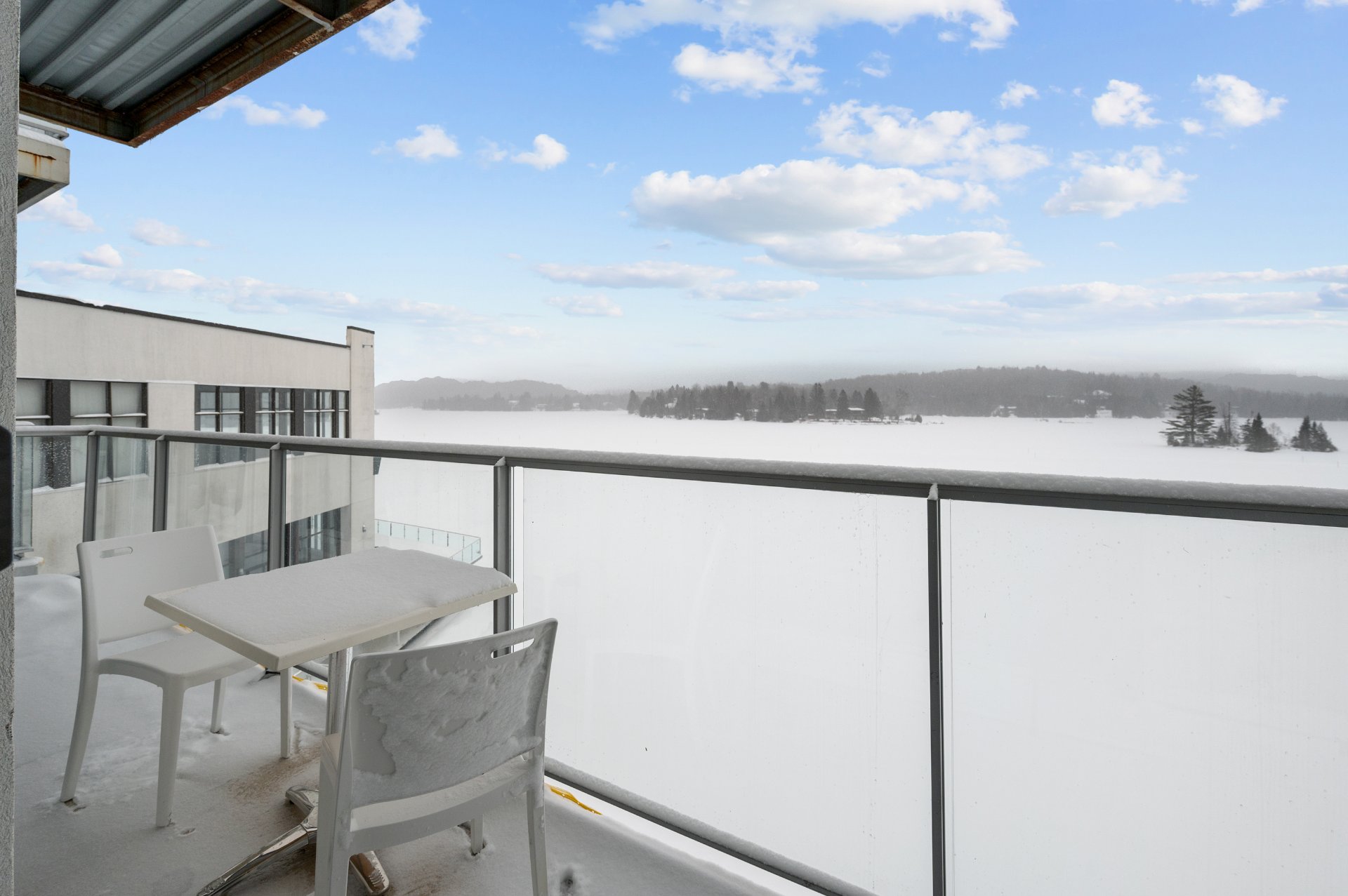 Estérel Resort - Nestled between two magnificent navigable lakes, this elegant open-plan suite offers a bedroom, a double-sided gas fireplace, a spacious bathroom, and a functional kitchenette. The glassed-in balcony allows you to enjoy the magnificent view of the lake all year round. Comfortably accommodating up to four people, this property benefits from all the amenities of the resort complex: swimming pools, spas, gym, restaurants, and more. A perfect place for a relaxing getaway or a well-considered investment in an enchanting location.