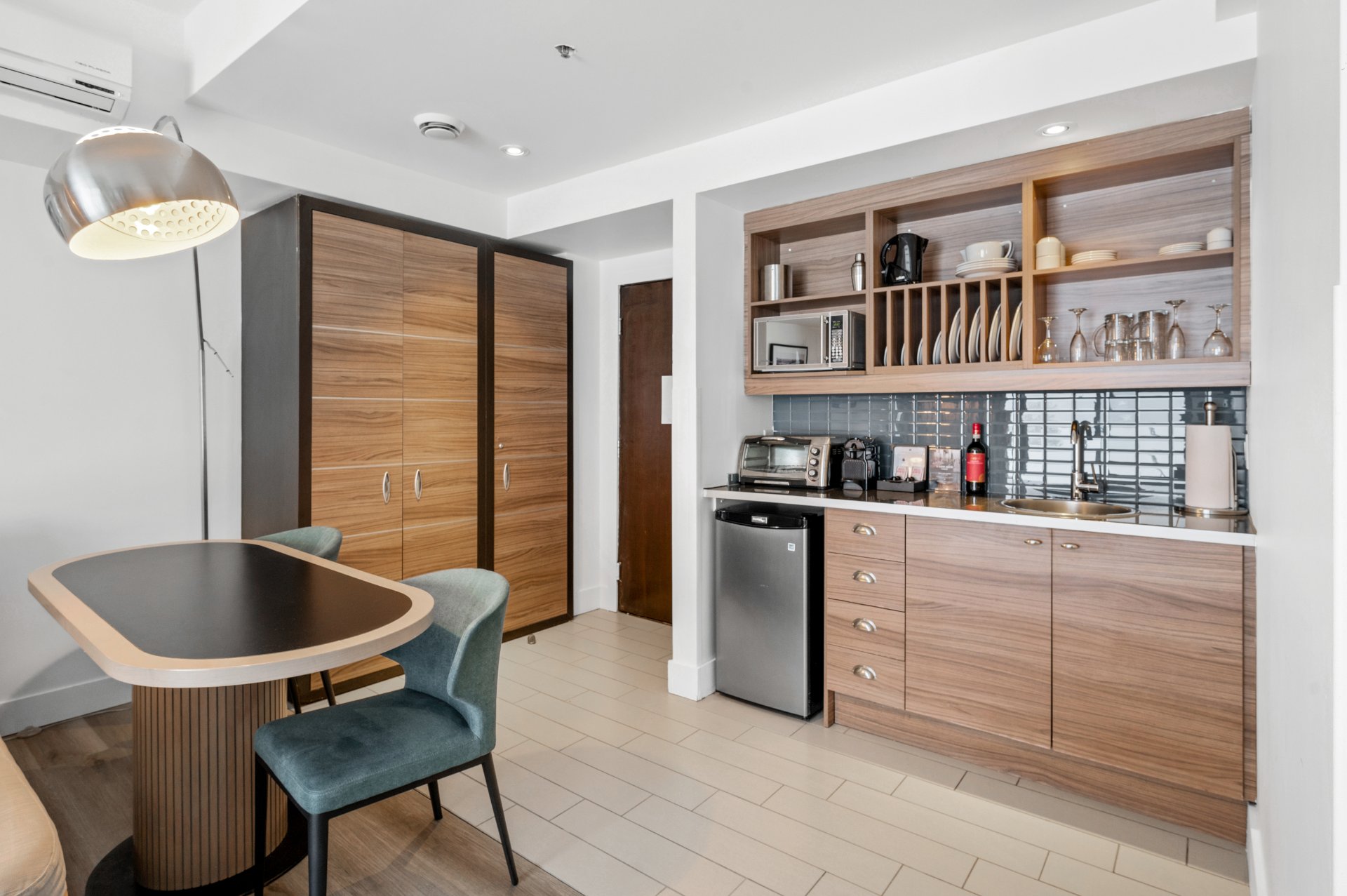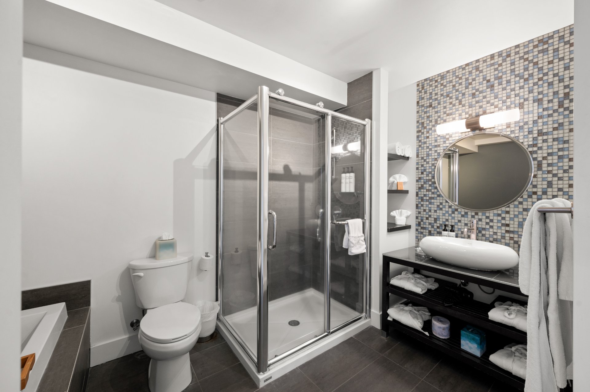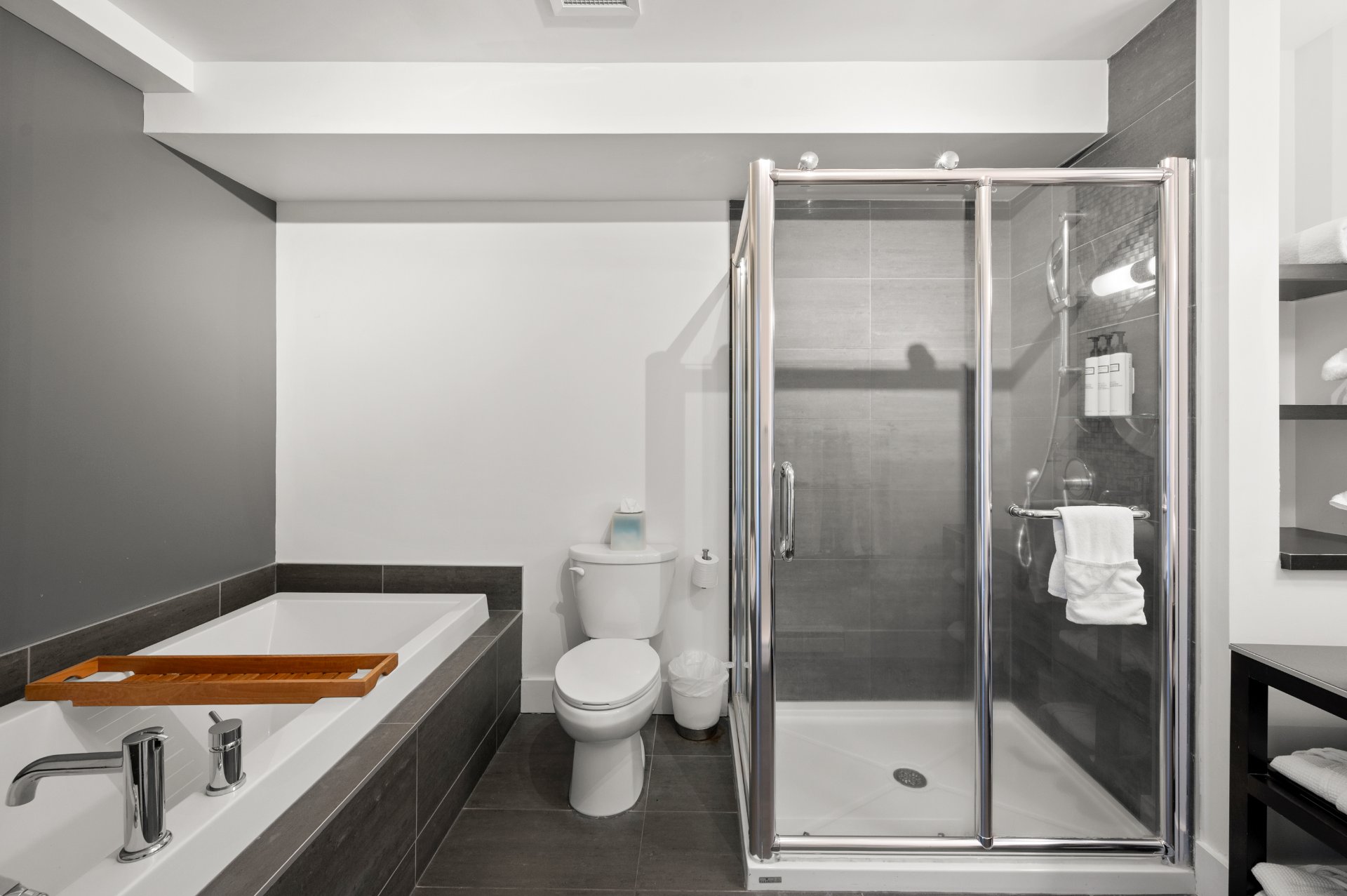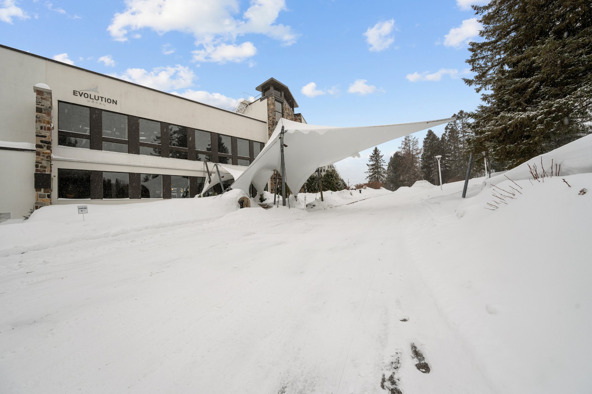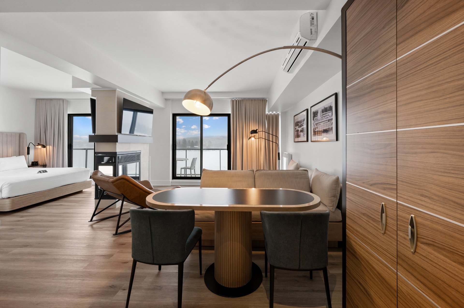 Estérel Resort - Nestled between two magnificent navigable lakes, this elegant open-plan suite offers a bedroom, a double-sided gas fireplace, a spacious bathroom, and a functional kitchenette. The glassed-in balcony allows you to enjoy the magnificent view of the lake all year round. Comfortably accommodating up to four people, this property benefits from all the amenities of the resort complex: swimming pools, spas, gym, restaurants, and more. A perfect place for a relaxing getaway or a well-considered investment in an enchanting location.