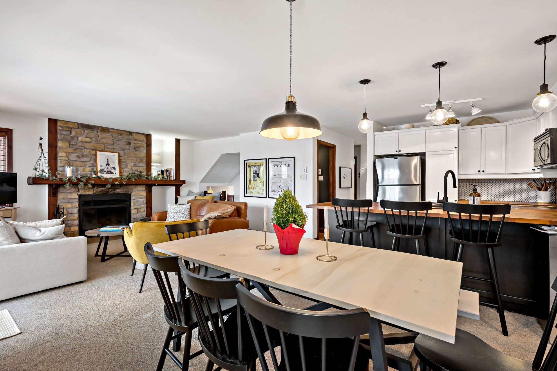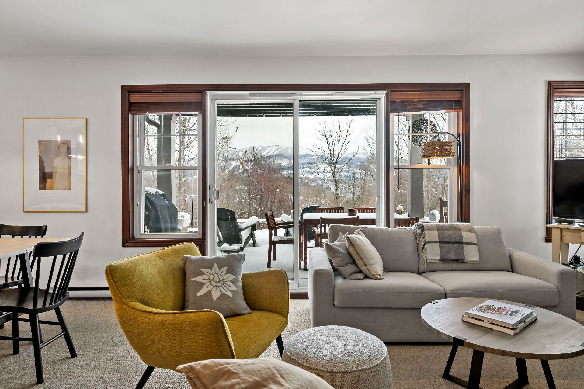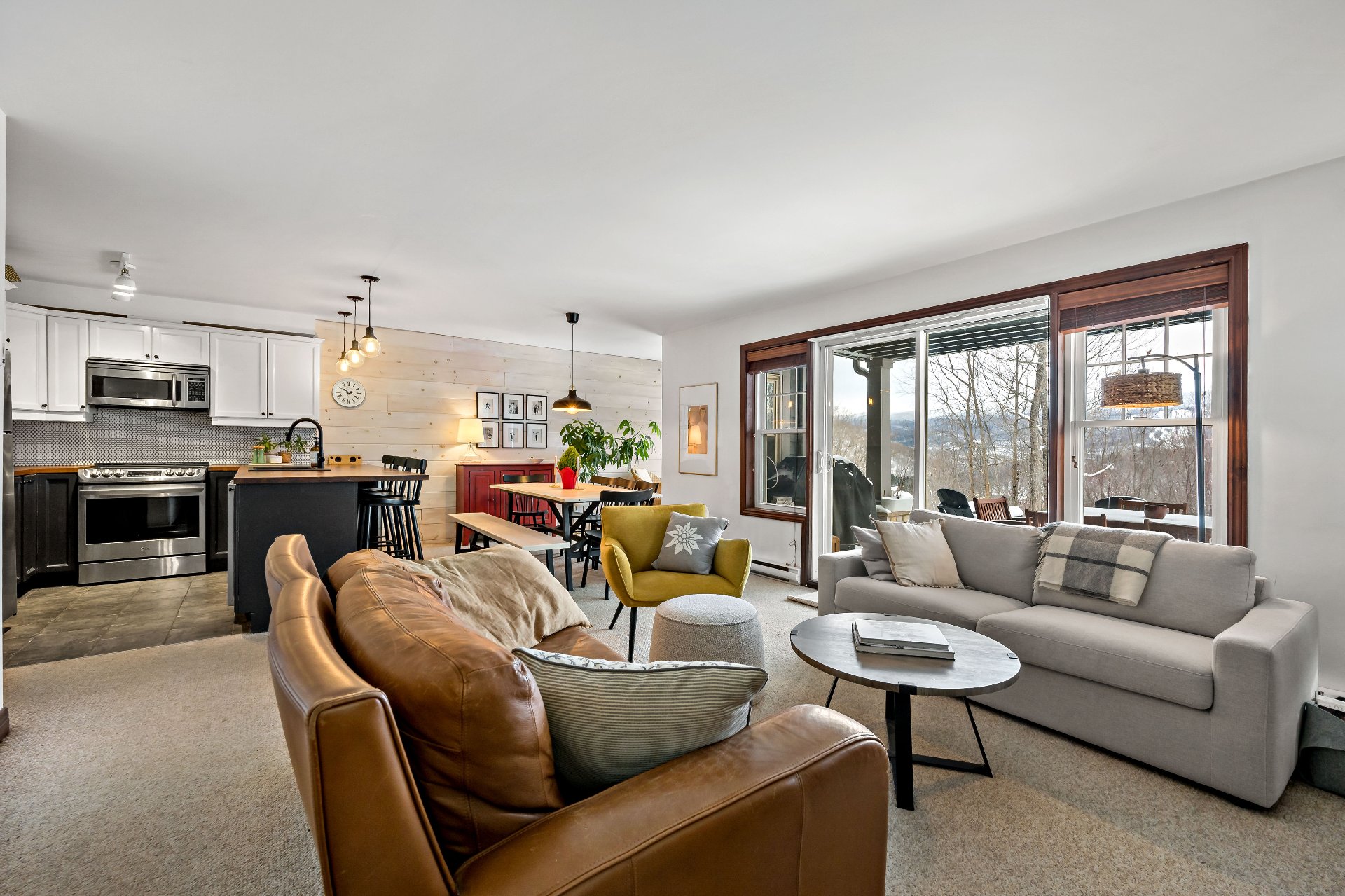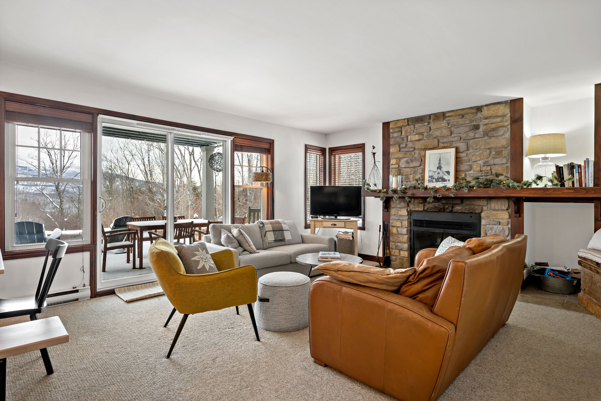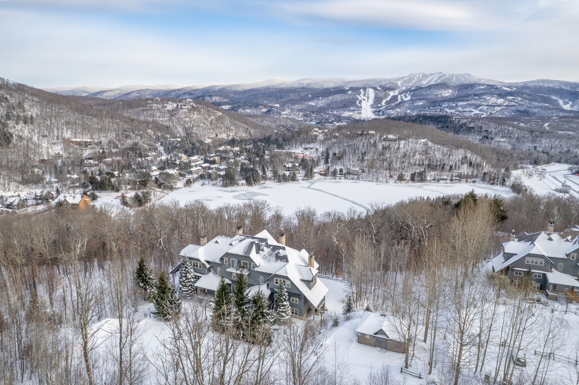 Cap Tremblant | Stunning condo offering an unparalleled view of the mountain! This fully renovated corner unit features a neat, elegant, and rustic style. Updated kitchen, modern bathroom with separate shower and bathtub, two bedrooms, and a large terrace to enjoy the panorama. The Valsorey Manoir offers a peaceful environment and neighborhood, ideal for unwinding while embracing the active lifestyle nearby. Less than 10 minutes from the Ski Resort and within walking distance of many cafés, beaches, shops, and outdoor skating rink! Access to a shared pool and spa. Tremblant awaits you!