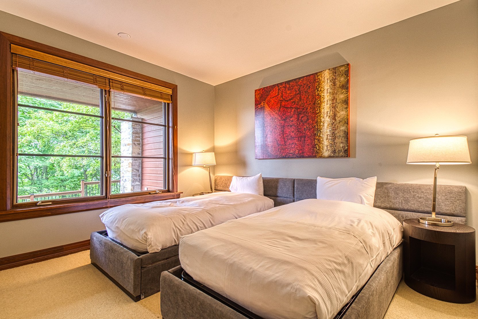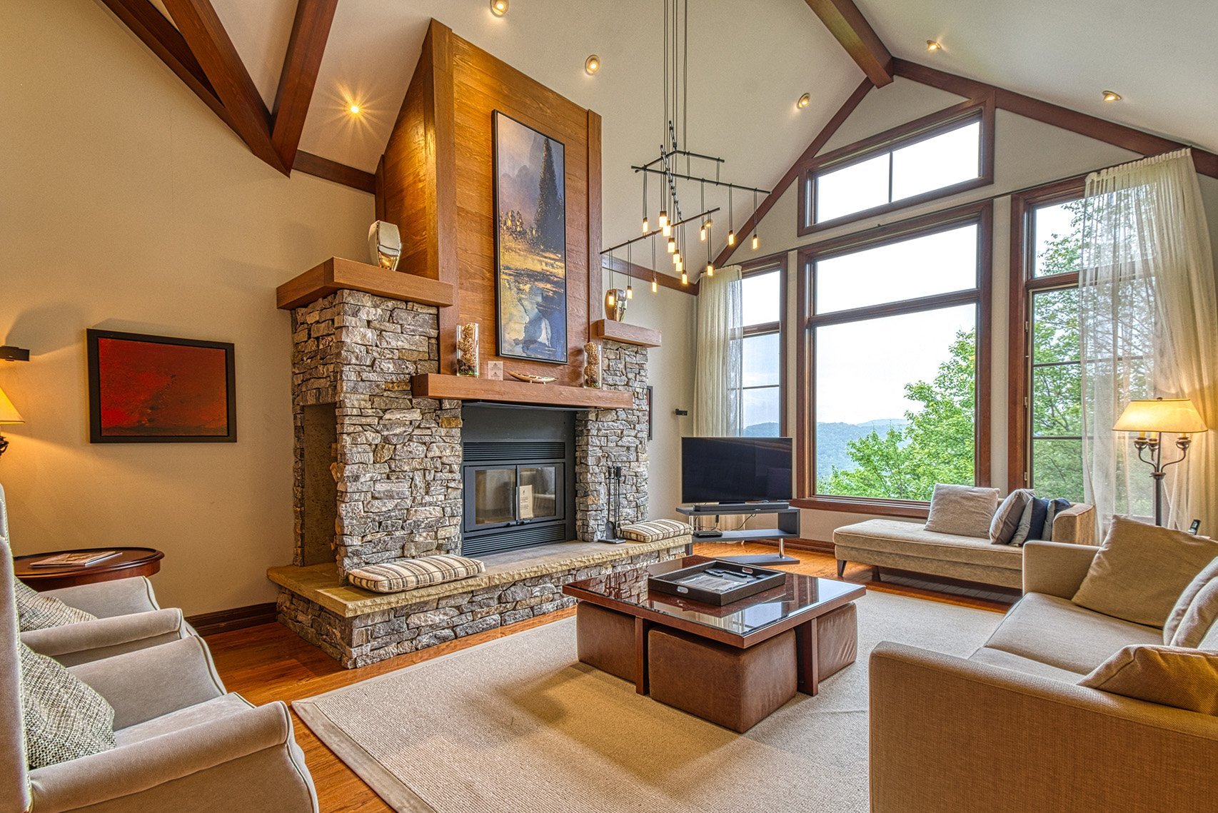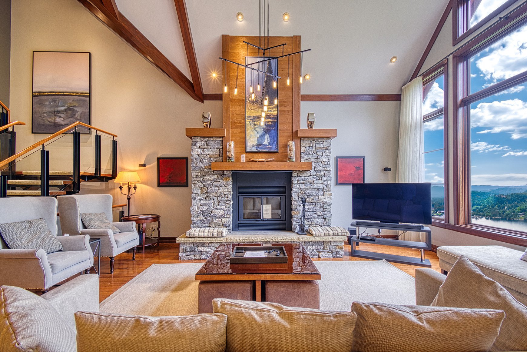 **Domaine Nansen - Légendes - Storied Places** Luxurious fully equipped townhouse on 3 floors offering a magnificent view of Lac-Tremblant and the surrounding mountains. Nestled in a private domain, this spacious residence has heated floors throughout, 4 beds + 3.5 baths. The house is equipped with high-end appliances, a state-of-the-art audio system, and a wood-burning fireplace. This ski-in/ski-out property has all these unparalleled amenities: infinity pool, private spa and shared spa, owners' lounge, indoor and outdoor parking, and shuttle to the resort and village. Fractional condo 1/10. Used by owner 5 weeks/year plus space available.