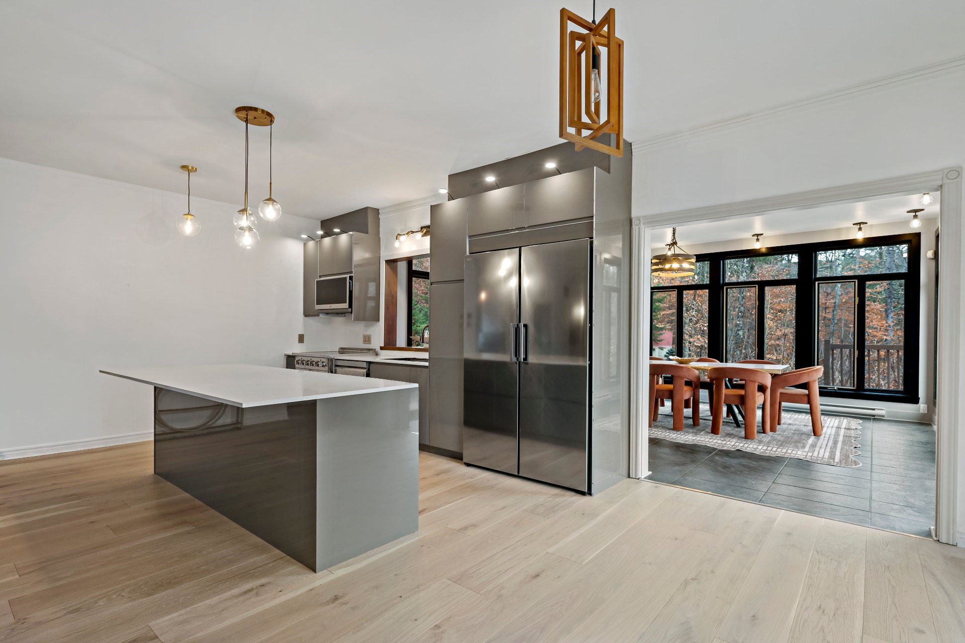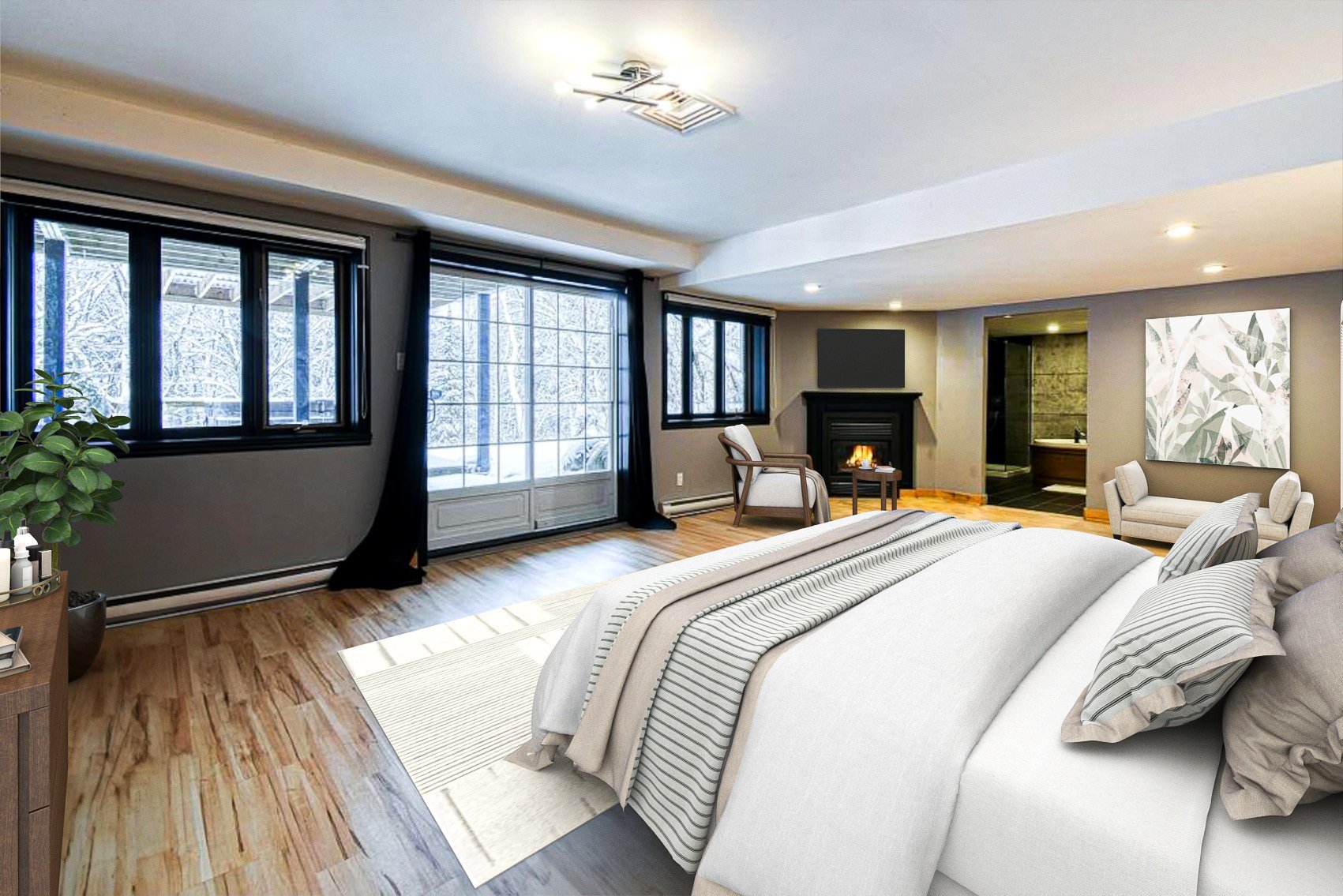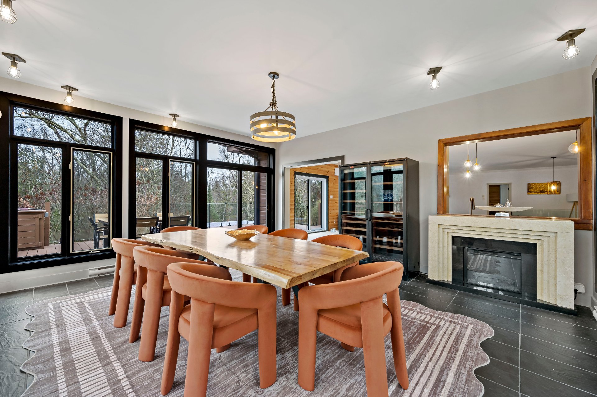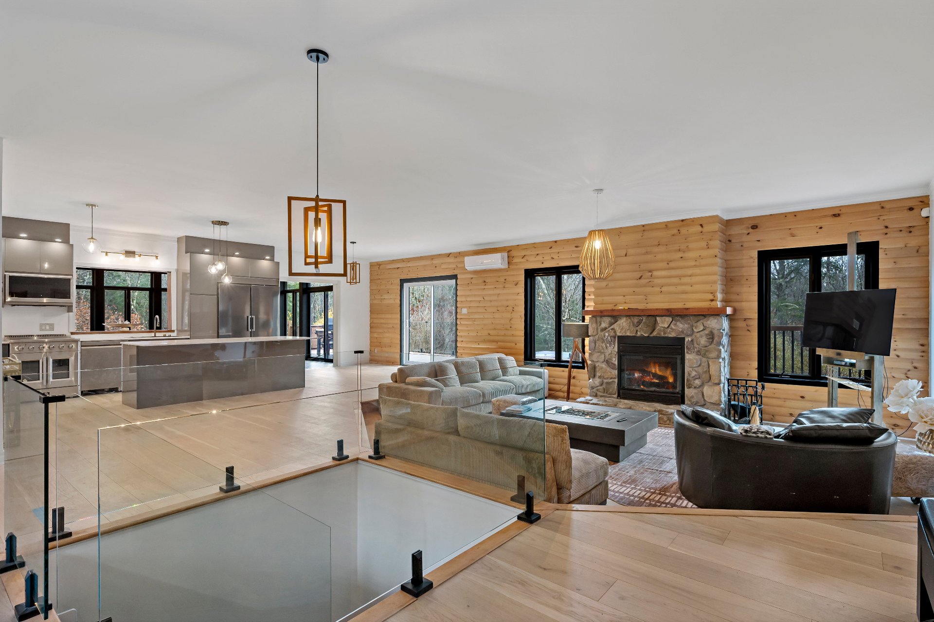 Magnificent freshly renovated property on a wooded lot of over 160,000 sq. ft. offering 5 bedrooms and 4 bathrooms. Every corner of this residence has been designed with unparalleled attention to detail, providing a luxurious and harmonious lifestyle. You will discover, among other features, a spacious open concept with generous windows, a stunning fireplace, and a huge terrace. The kitchen will charm you with its panoramic view of nature, floor-to-ceiling cabinets, and large central island. In the basement, there is a steam sauna, a 2nd fireplace, 2 bedrooms, 2 bathrooms, an outside spa, and much more, see addendum.