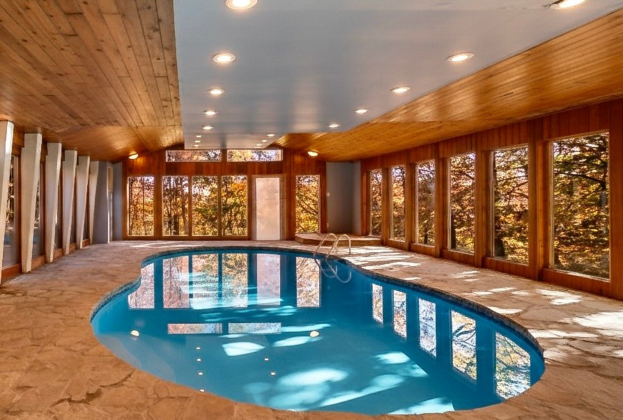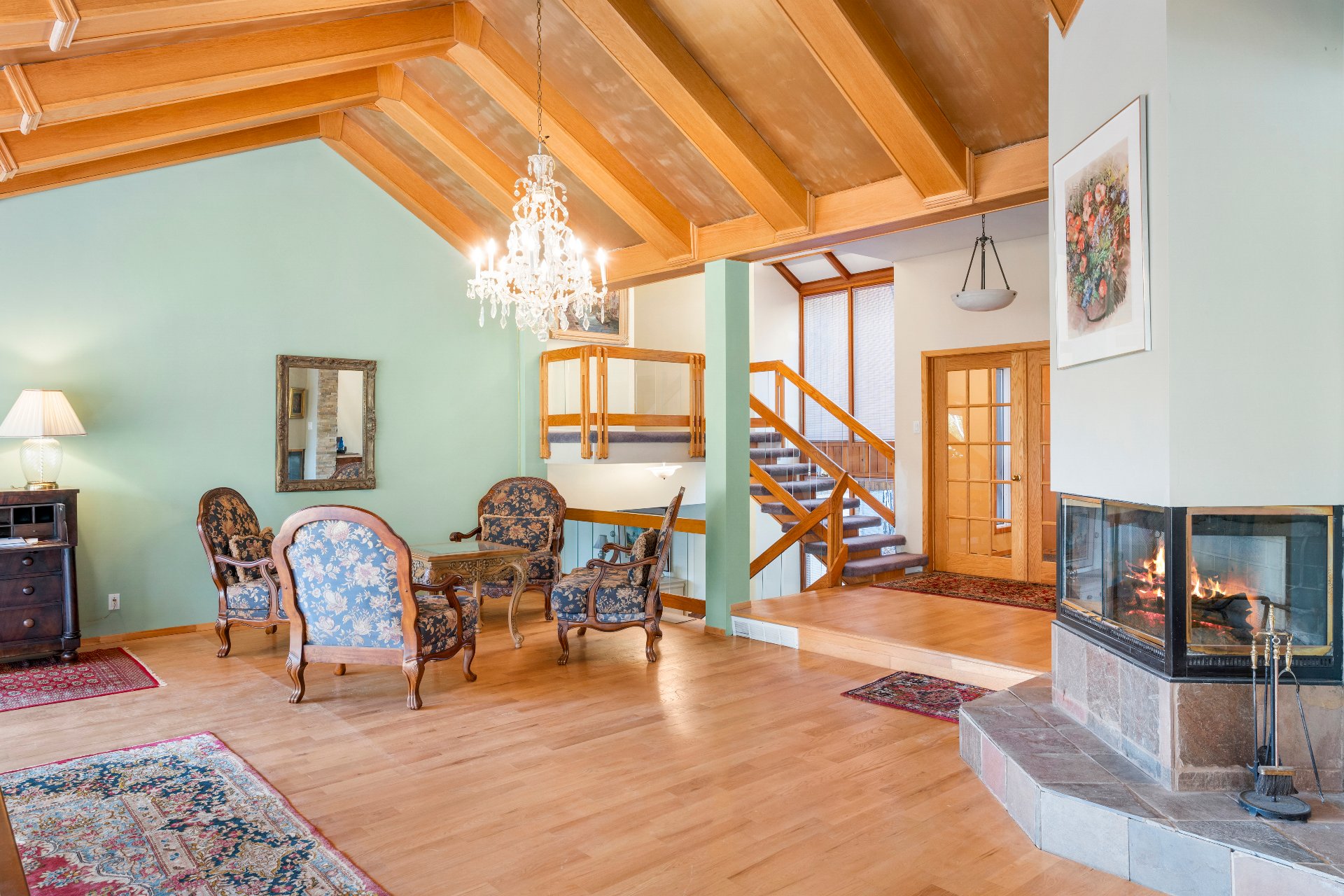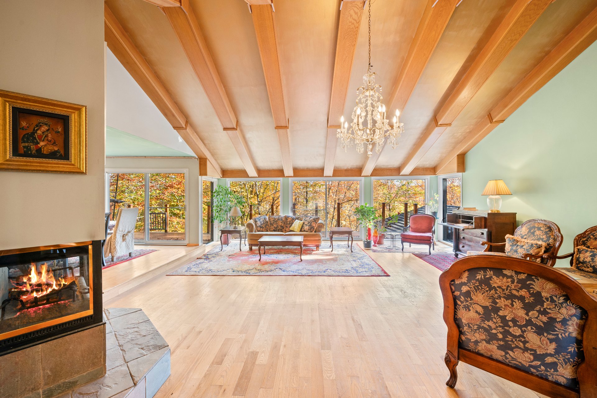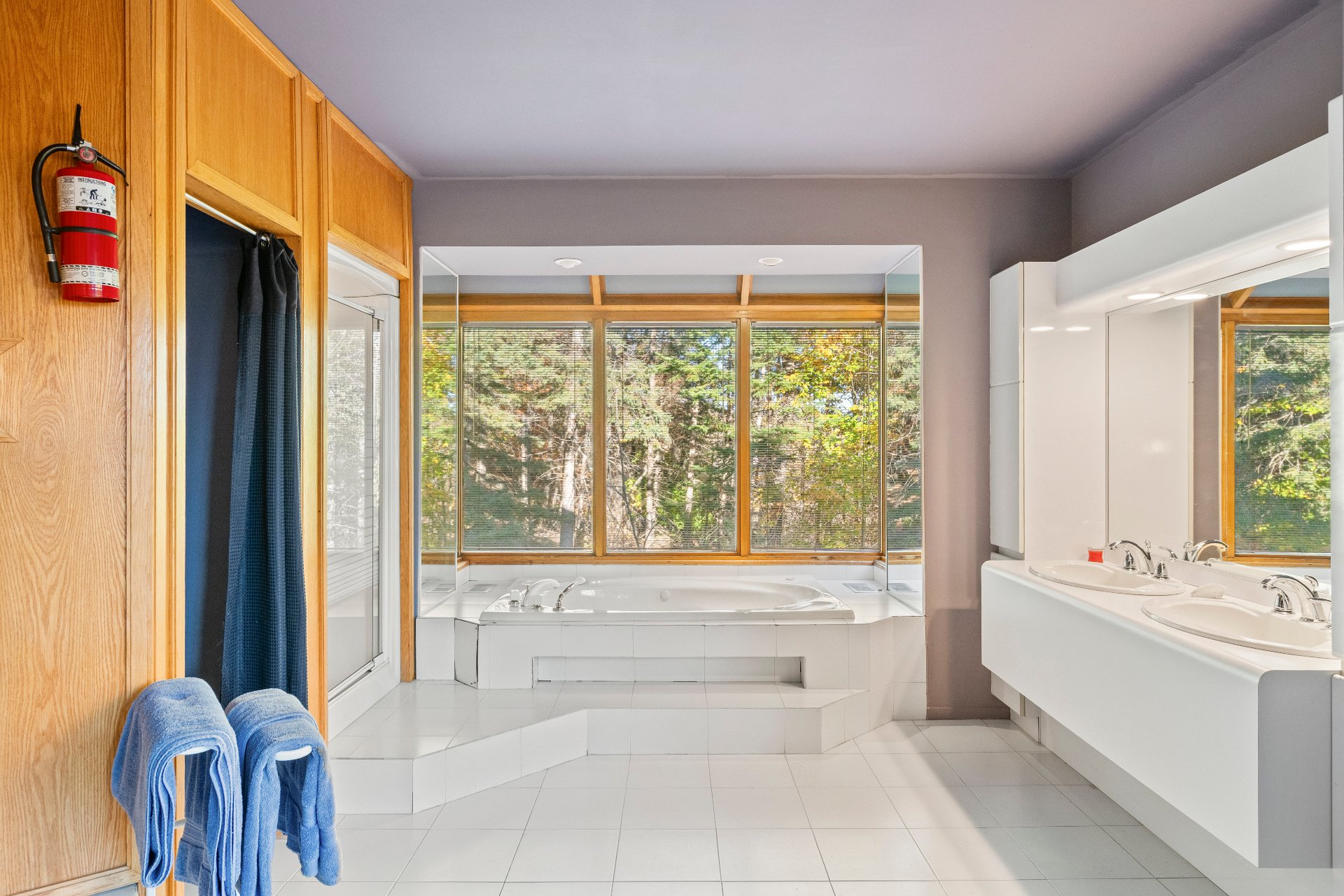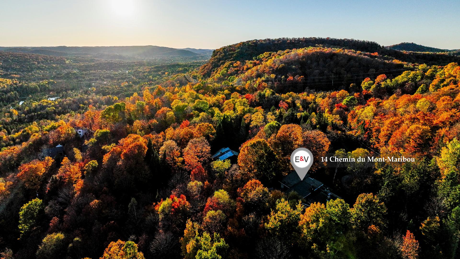 Summit of Mont-Maribou -- one of the most spectacular views in St-Sauveur. Large residence with over 5,000 sq. ft. of living space, featuring an indoor concrete pool, gym, billiard room, TV room, family room, 3 wood-burning fireplaces, 5 bedrooms, 4 bathrooms, and a double garage. A rare opportunity for a renovation project or simply an upgrade that will yield exceptional results and create value far exceeding the investment. Currently peaceful and comfortable with all systems in perfect working order. Direct access to the Portageur hiking trail, connected to the extensive Laurentian network.