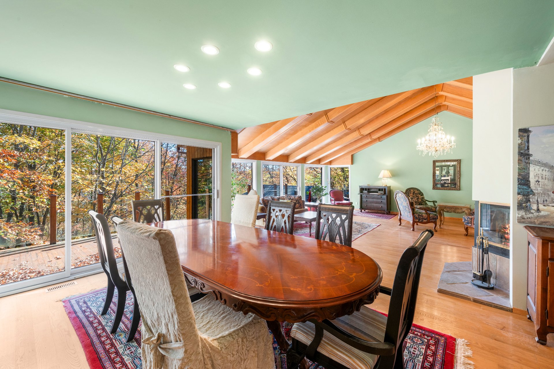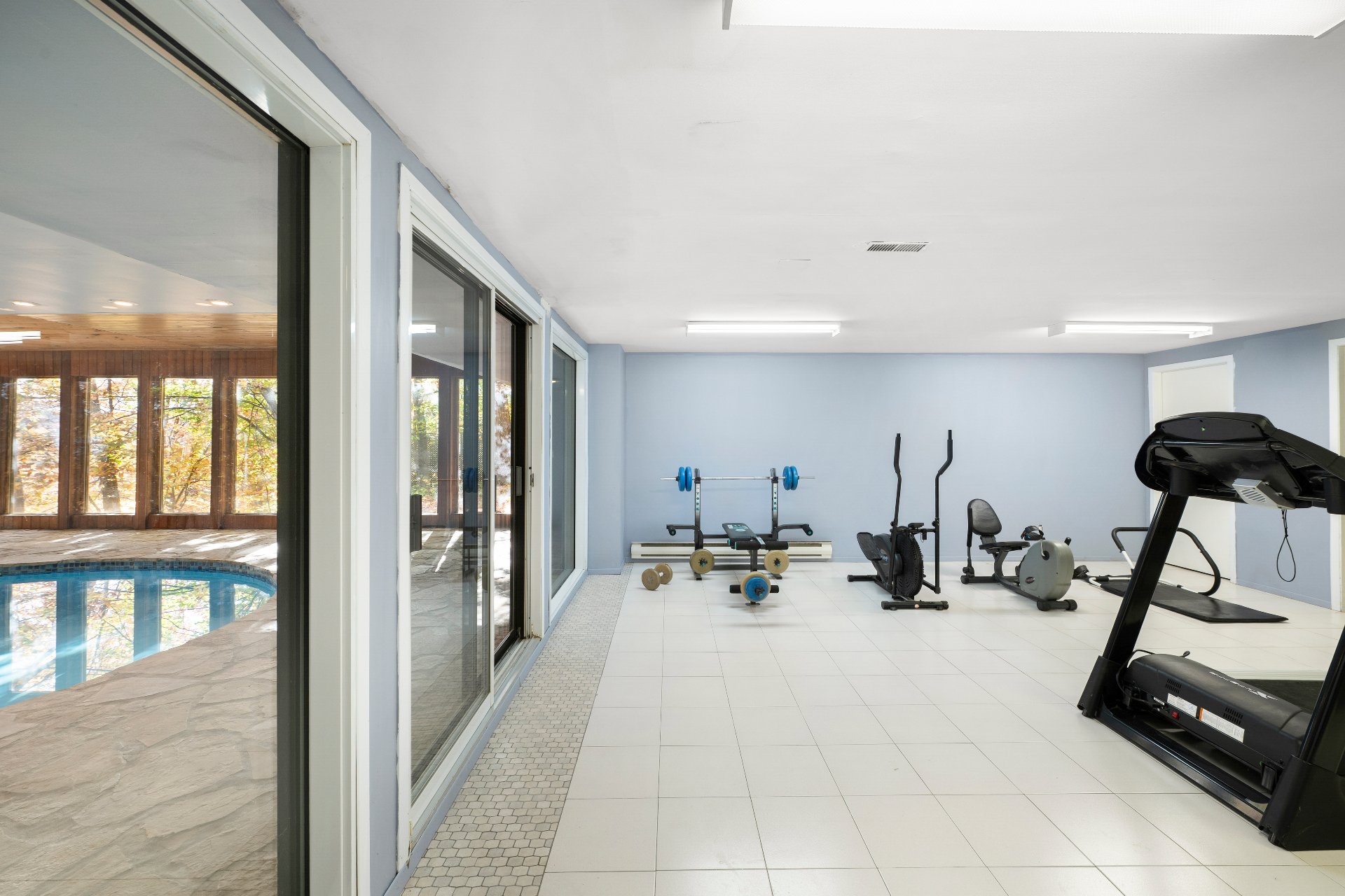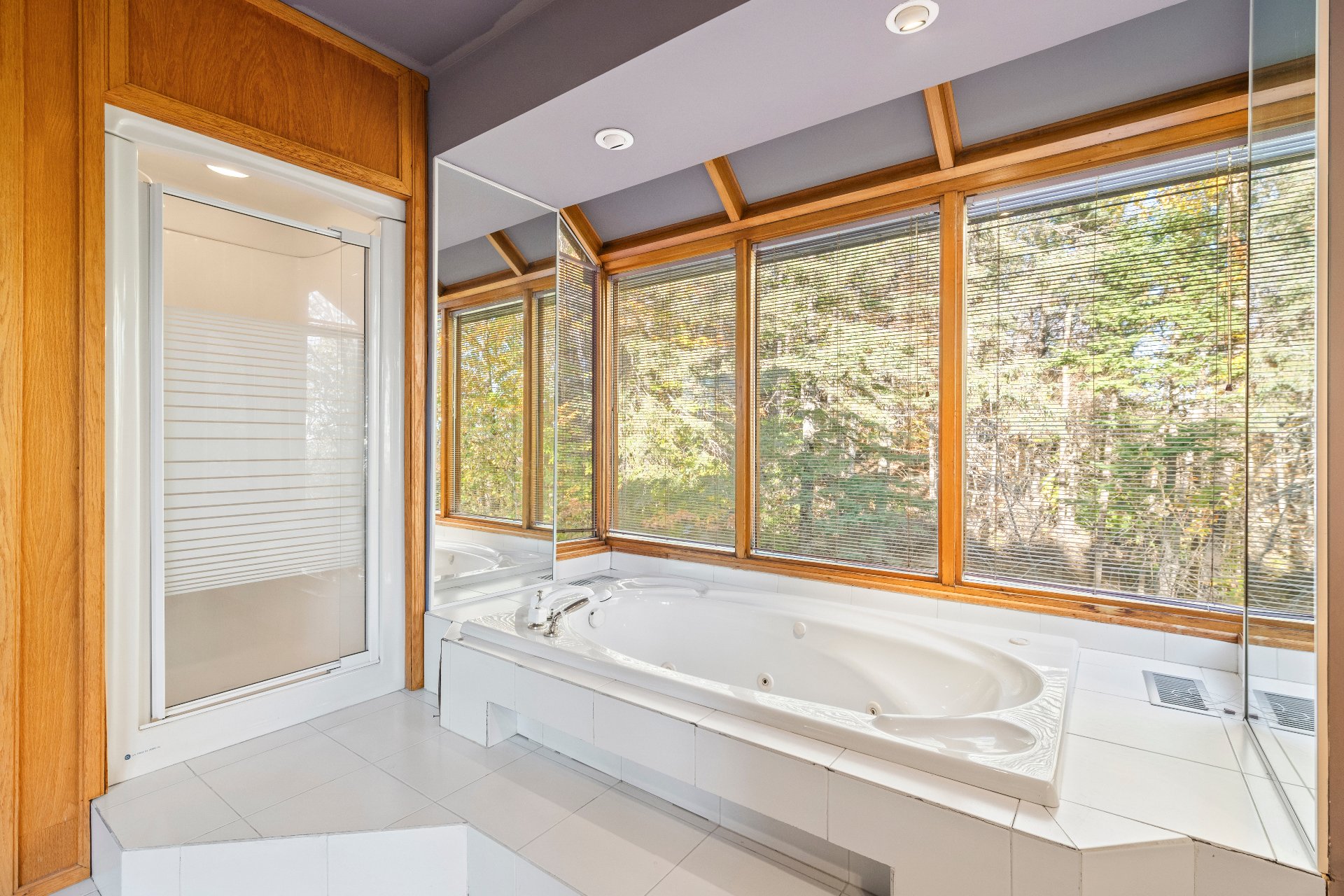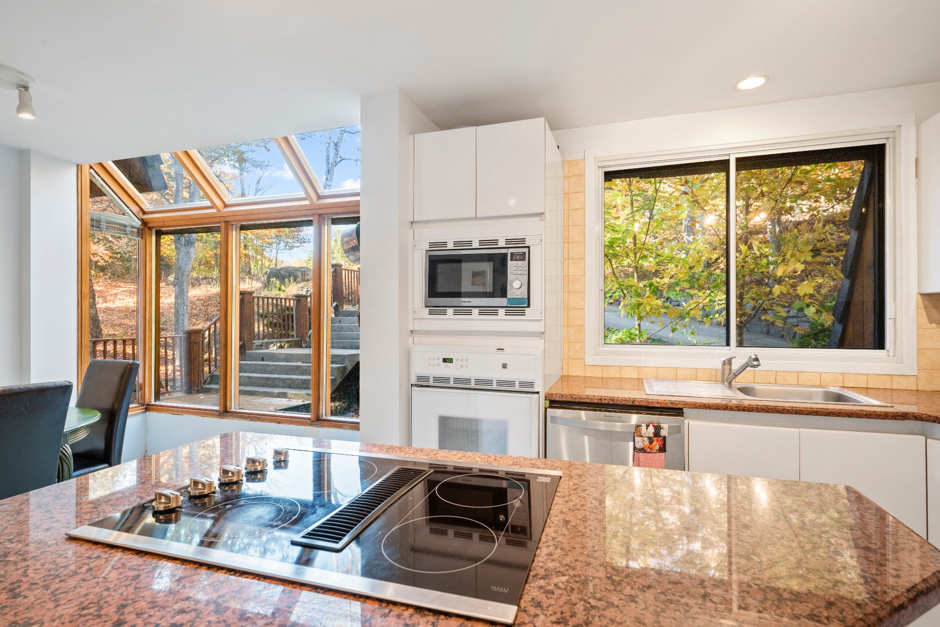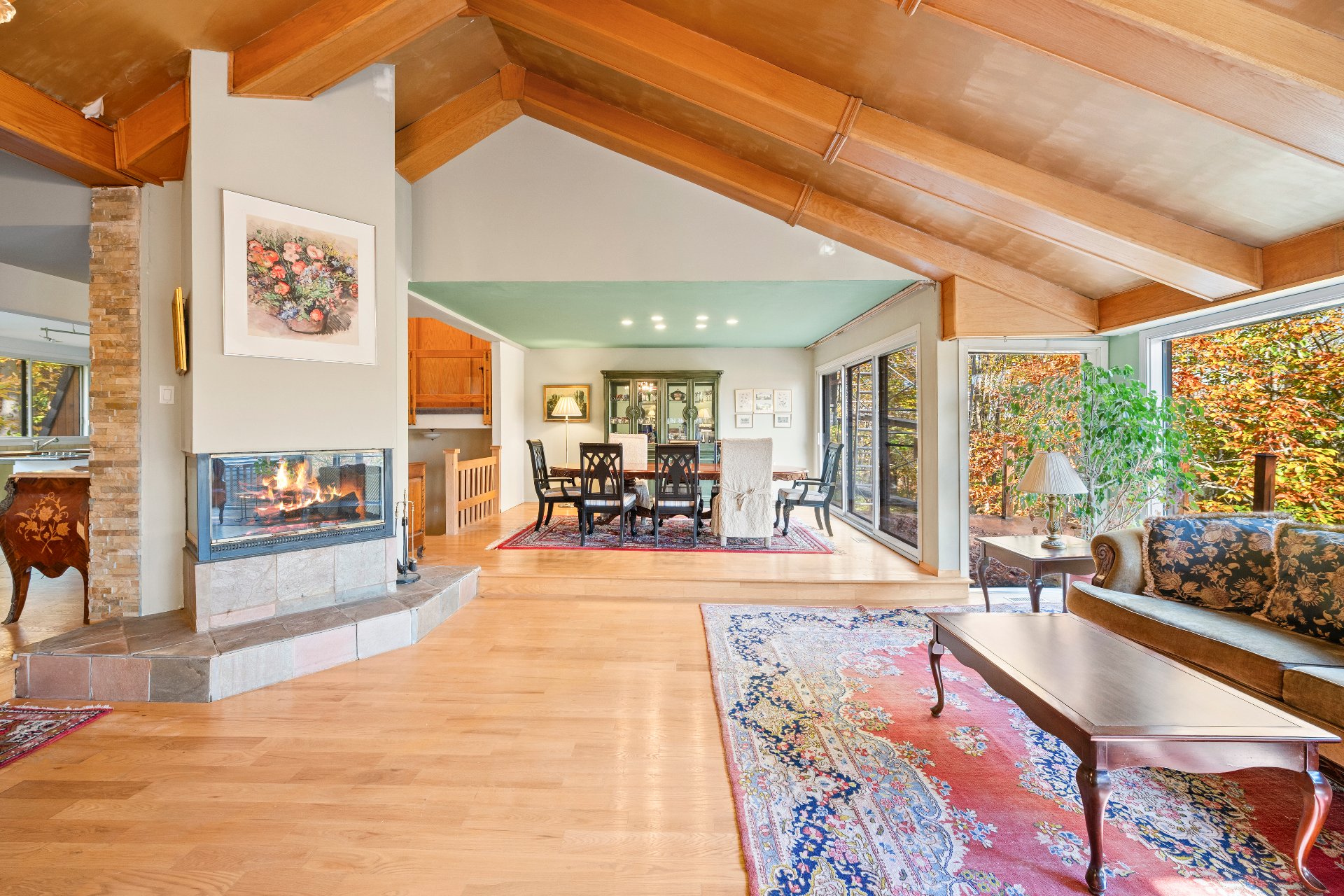 Summit of Mont-Maribou -- one of the most spectacular views in St-Sauveur. Large residence with over 5,000 sq. ft. of living space, featuring an indoor concrete pool, gym, billiard room, TV room, family room, 3 wood-burning fireplaces, 5 bedrooms, 4 bathrooms, and a double garage. A rare opportunity for a renovation project or simply an upgrade that will yield exceptional results and create value far exceeding the investment. Currently peaceful and comfortable with all systems in perfect working order. Direct access to the Portageur hiking trail, connected to the extensive Laurentian network.