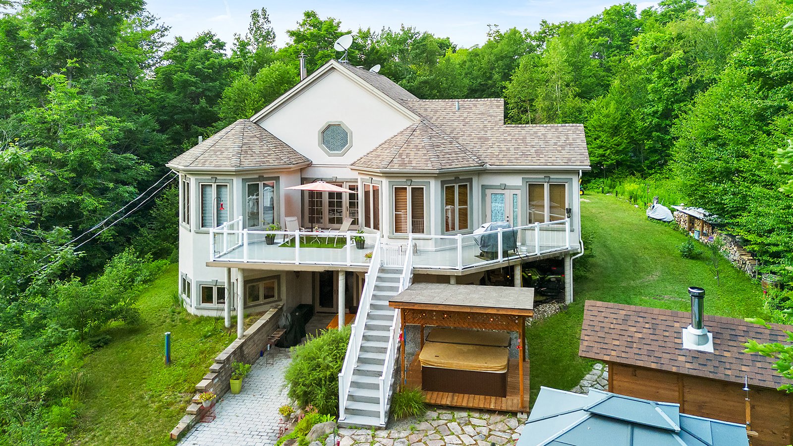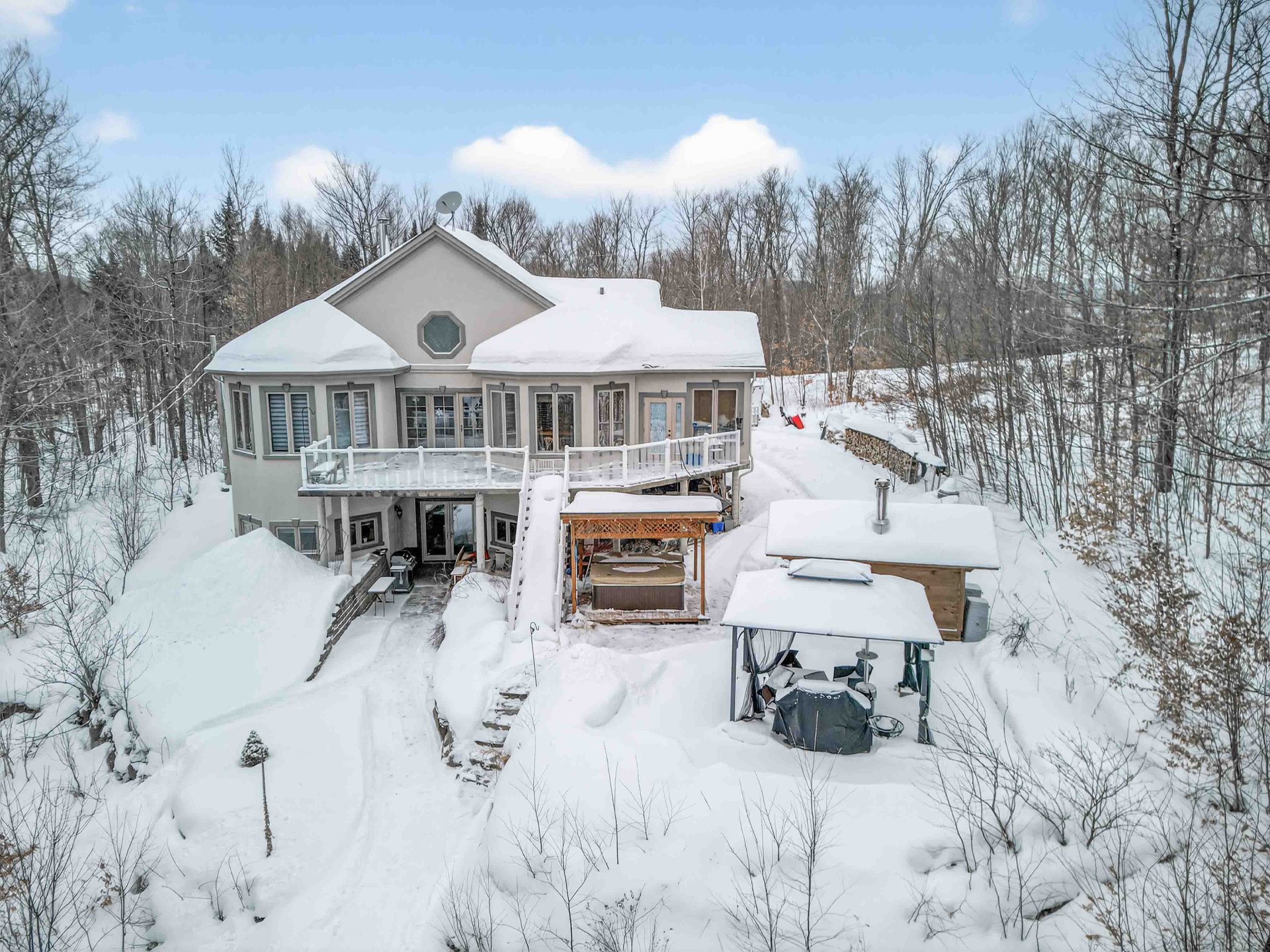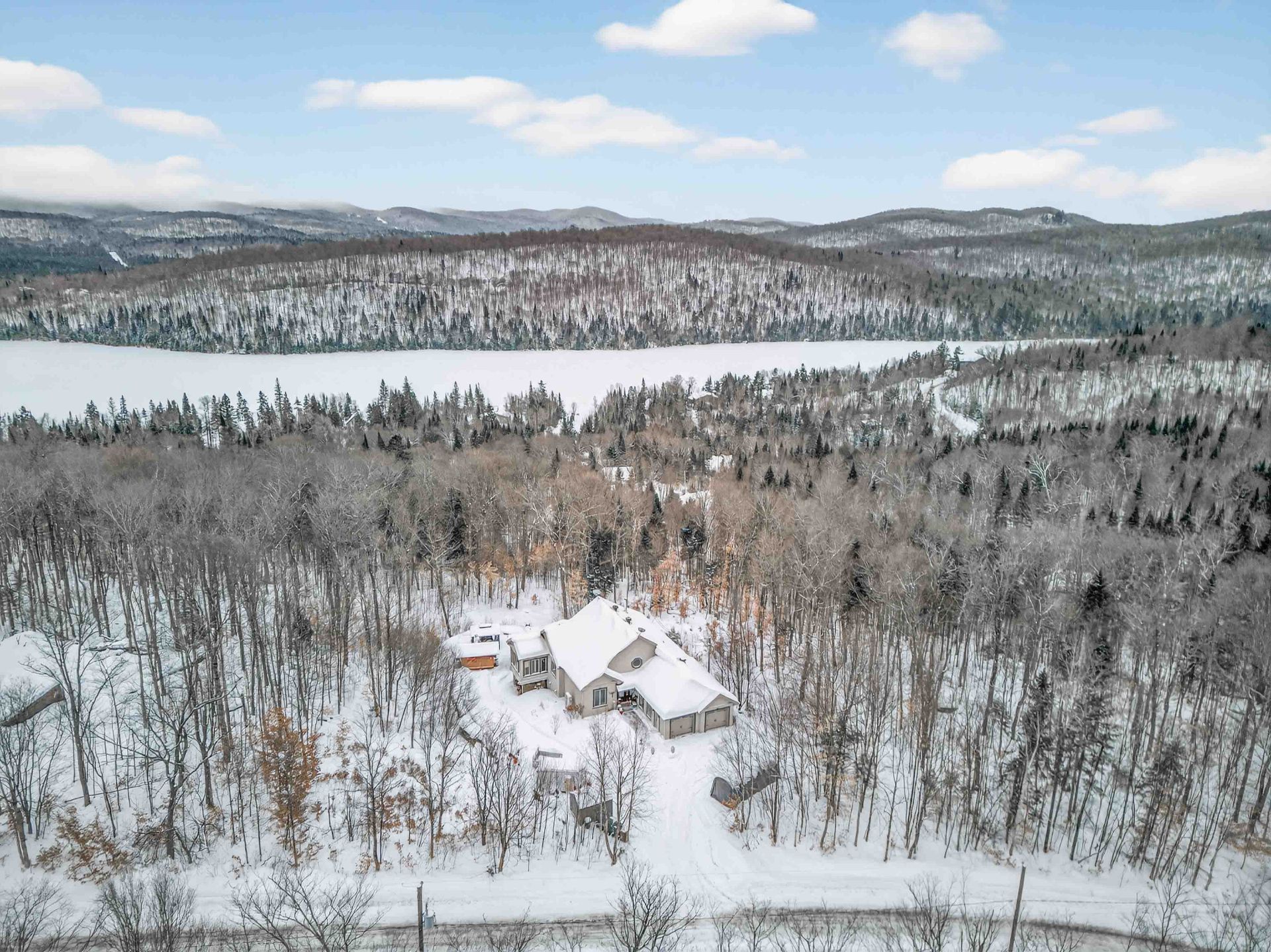 Discover this expansive property with generous living spaces, offering breathtaking lake views and access to Lac Quenouille, a sought-after navigable lake. Set on a large, private lot, it provides a peaceful and highly desirable living environment. Designed for absolute comfort, the home features heated floors throughout, an attached double garage, and a fully finished basement with 9-foot ceilings and a game room. Abundant windows flood the interior with natural light. A private spa and sauna complete this exceptional residence, conveniently located near essential services and just 30 minutes from Mont-Tremblant and Mont-Garceau.