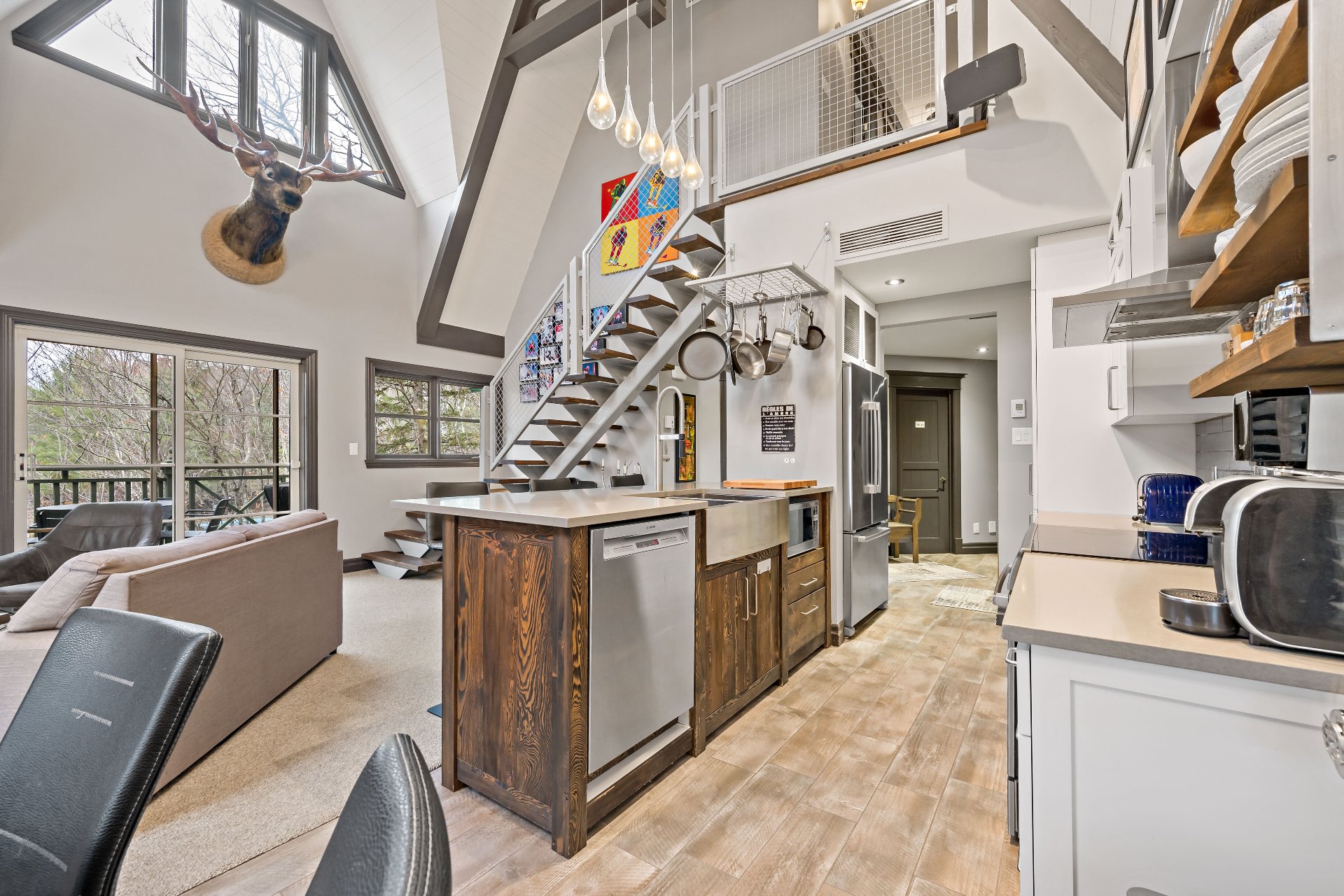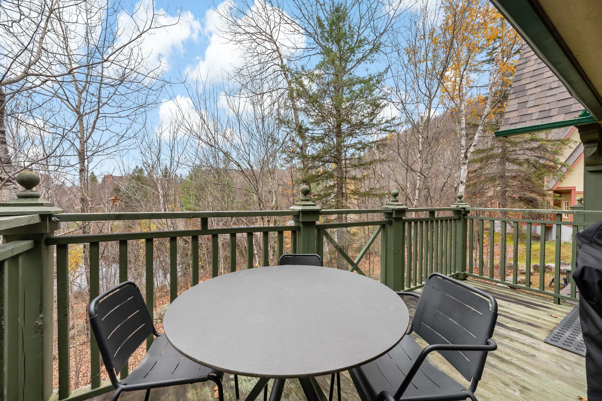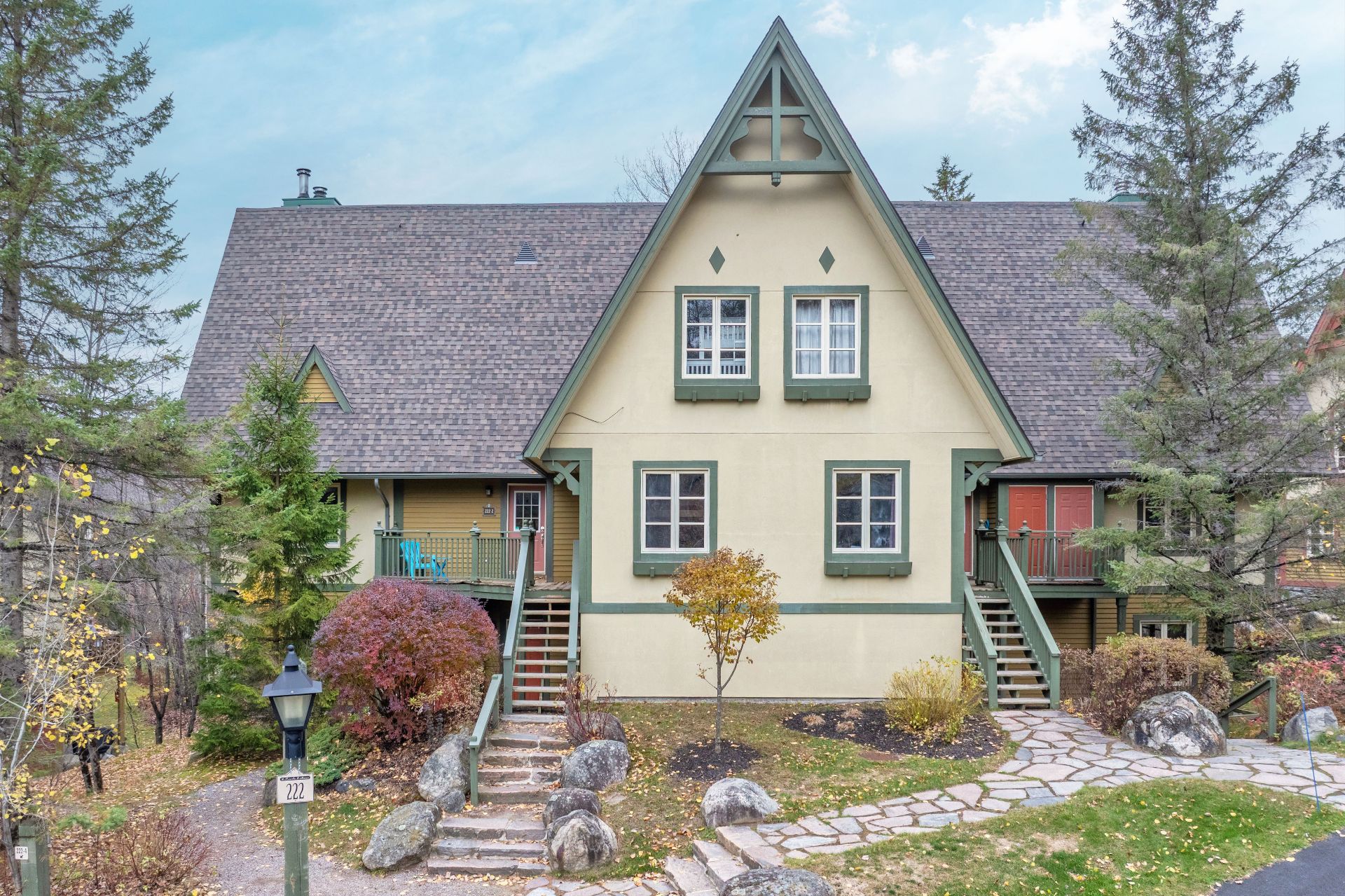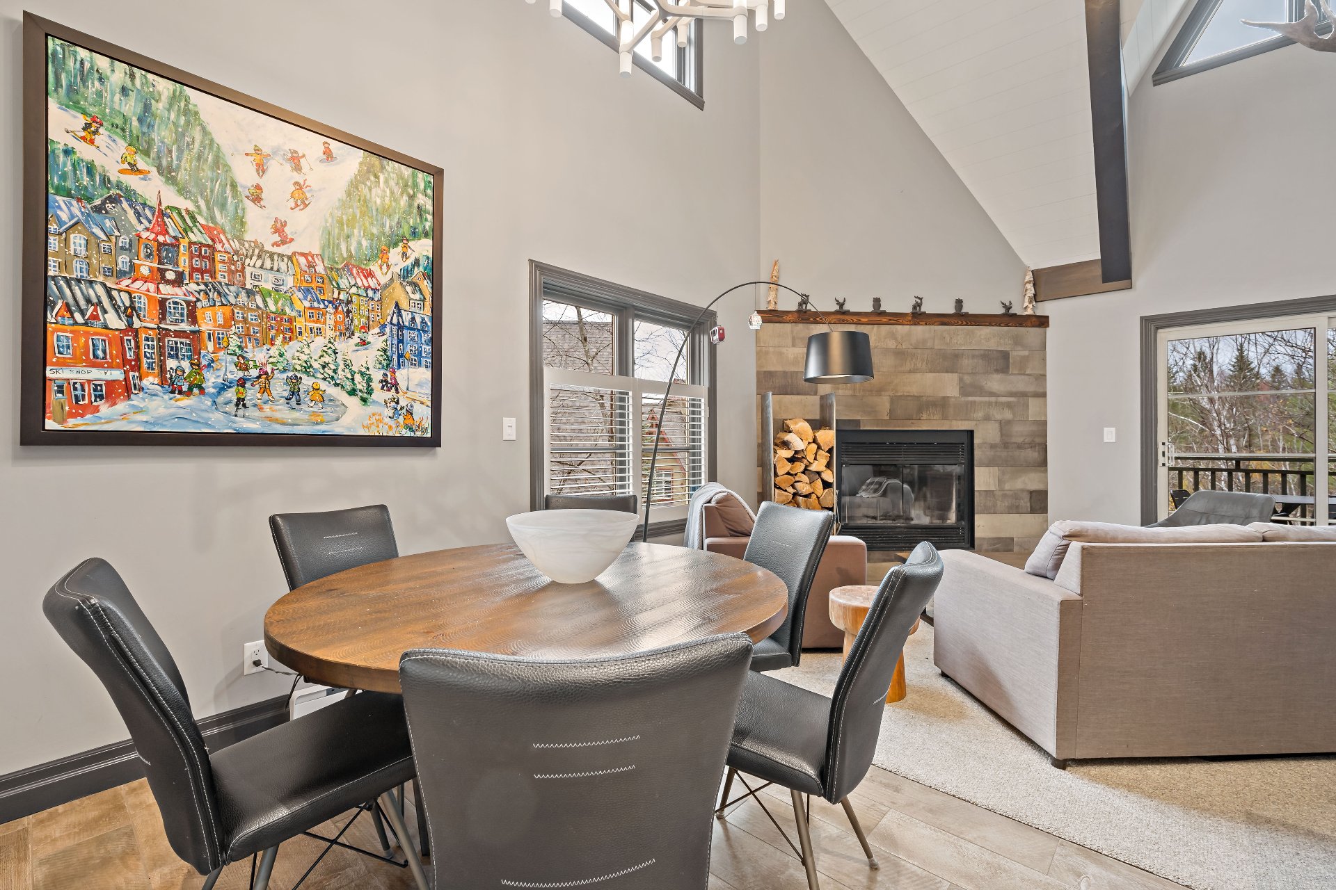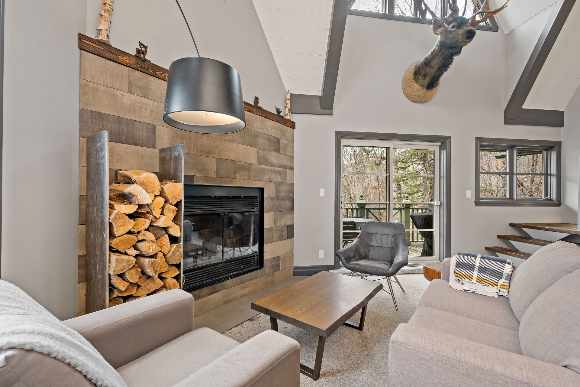 Plateau sur la Montagne | Beautiful corner unit offering incredible ski-in/ski-out access and a large private balcony overlooking the woods, pond, and shared in-ground pool. Stunning modern condo with cathedral ceilings, wood-burning fireplace, heated floors, 3 bedrooms + family room that can easily serve as a fourth bedroom. Peaceful environment, just steps away from the vibrant pedestrian village and its countless shops and restaurants. Unbeatable location, short-term rentals allowed! Take possession now and enjoy the ski season!
