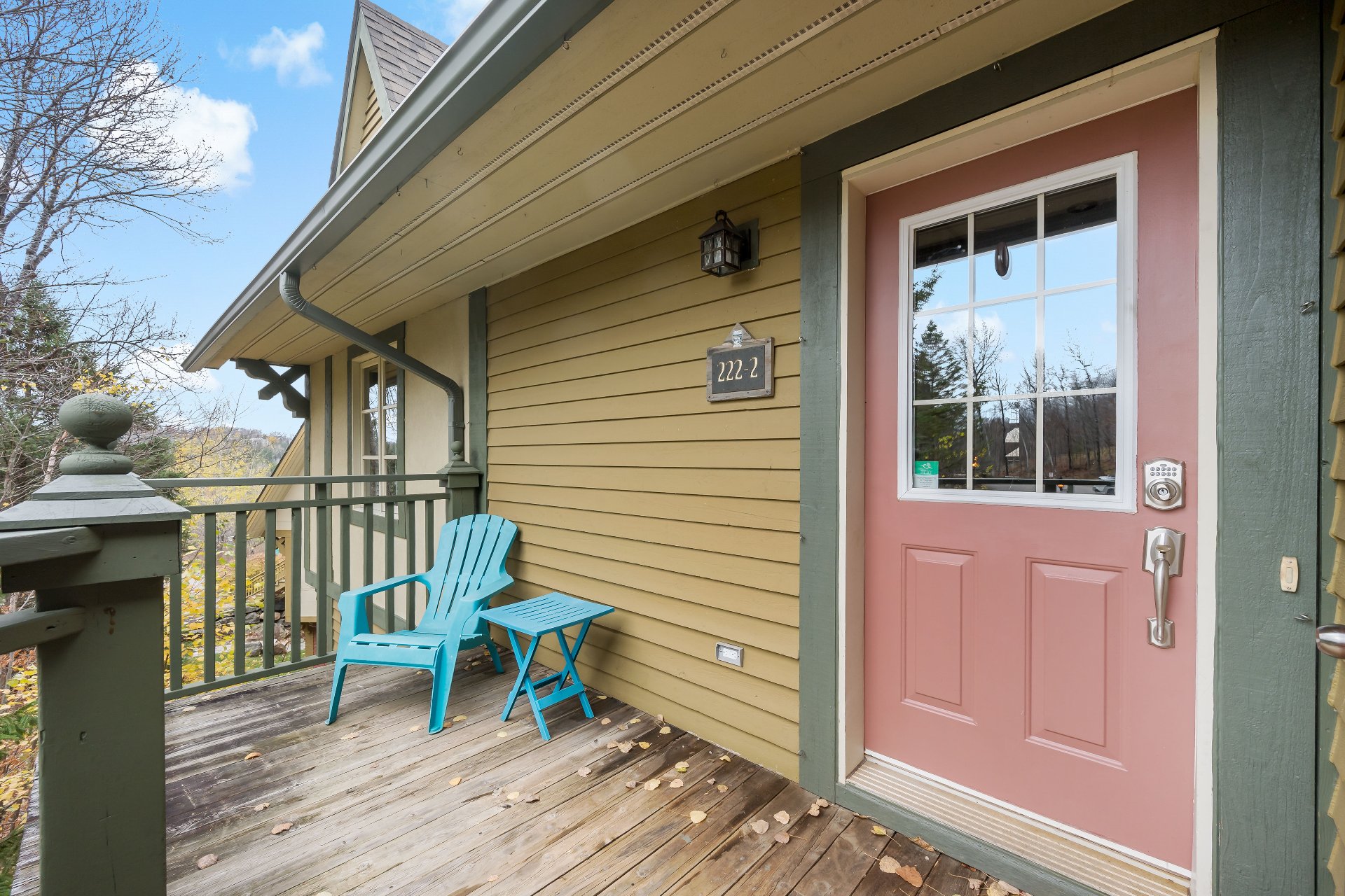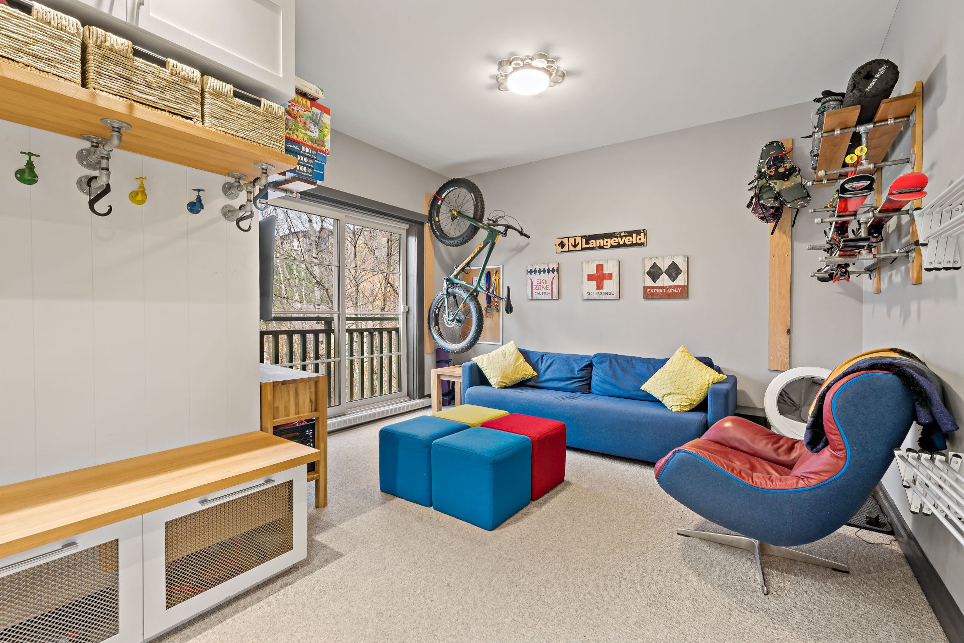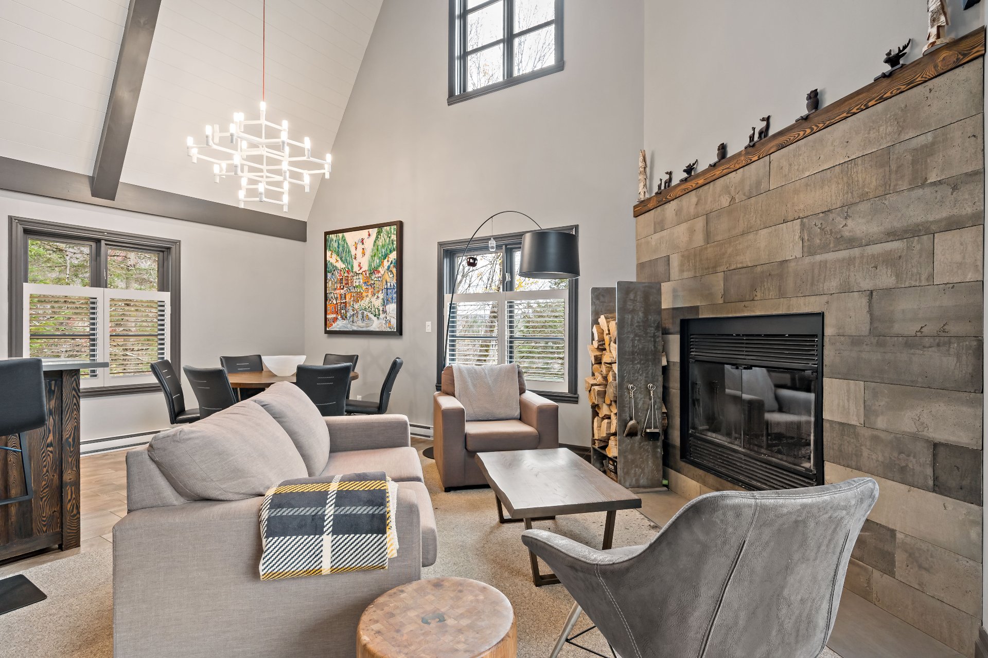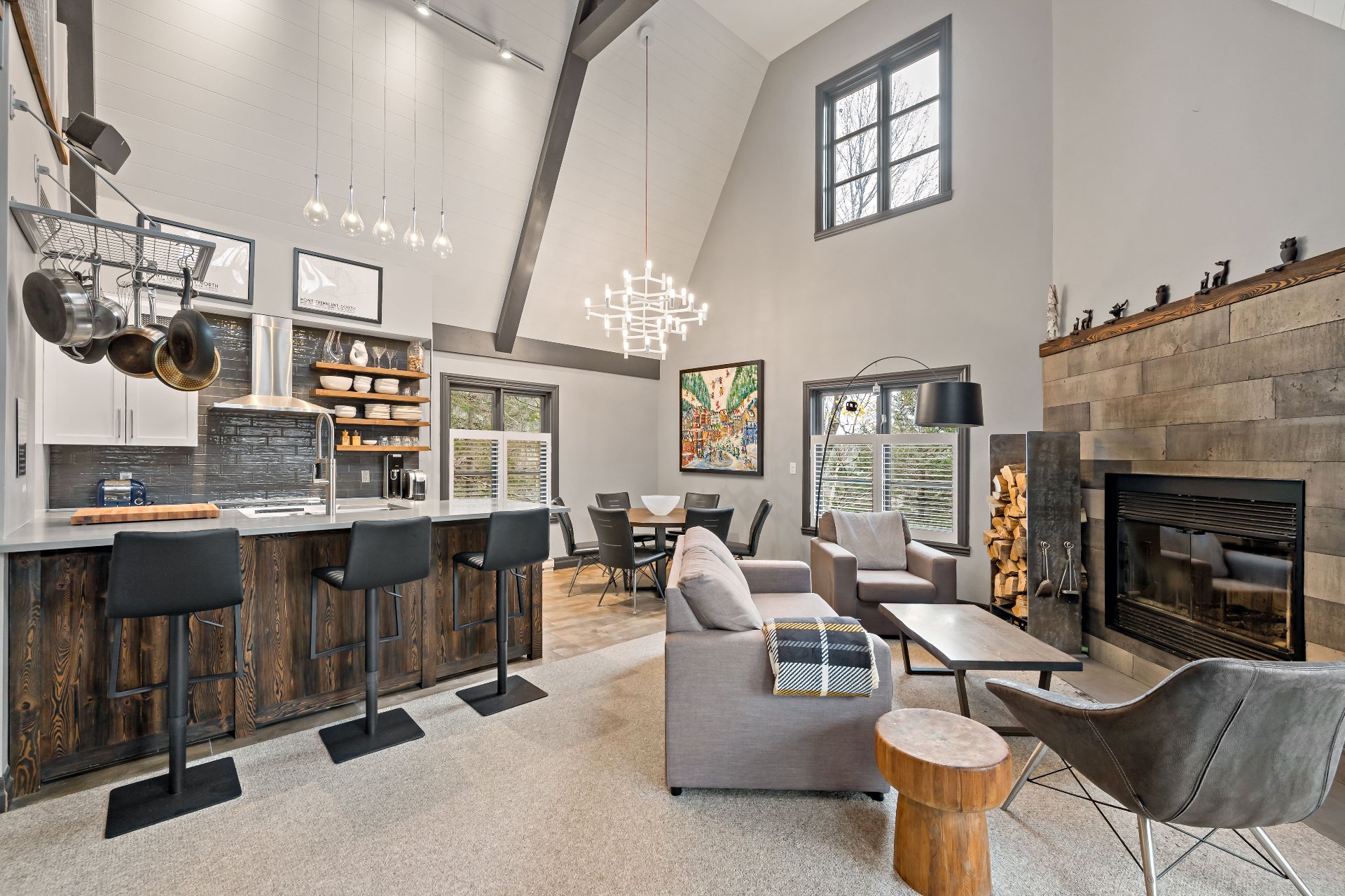 Plateau sur la Montagne | Beautiful corner unit offering incredible ski-in/ski-out access and a large private balcony overlooking the woods, pond, and shared in-ground pool. Stunning modern condo with cathedral ceilings, wood-burning fireplace, heated floors, 3 bedrooms + family room that can easily serve as a fourth bedroom. Peaceful environment, just steps away from the vibrant pedestrian village and its countless shops and restaurants. Unbeatable location, short-term rentals allowed! Take possession now and enjoy the ski season!