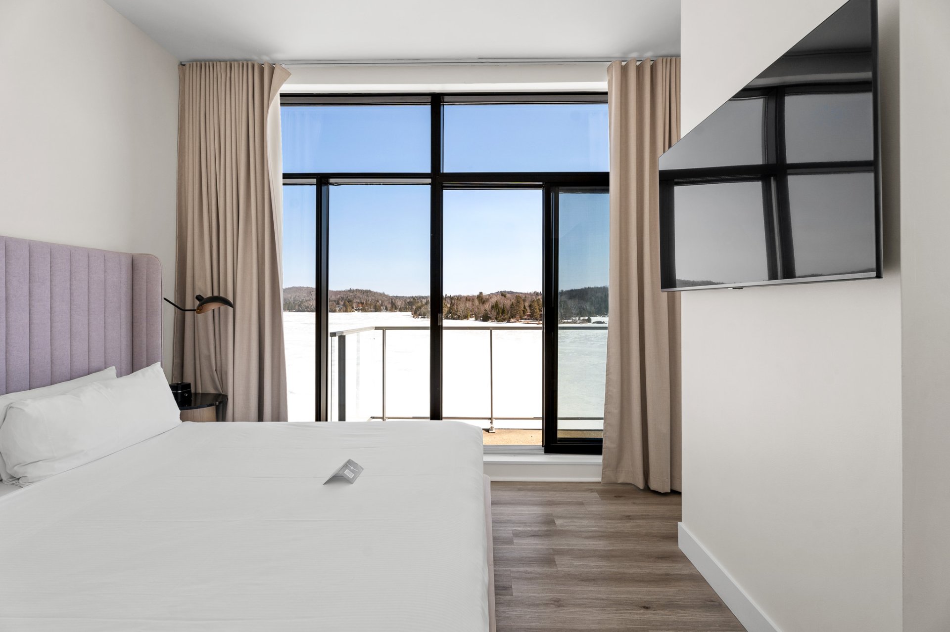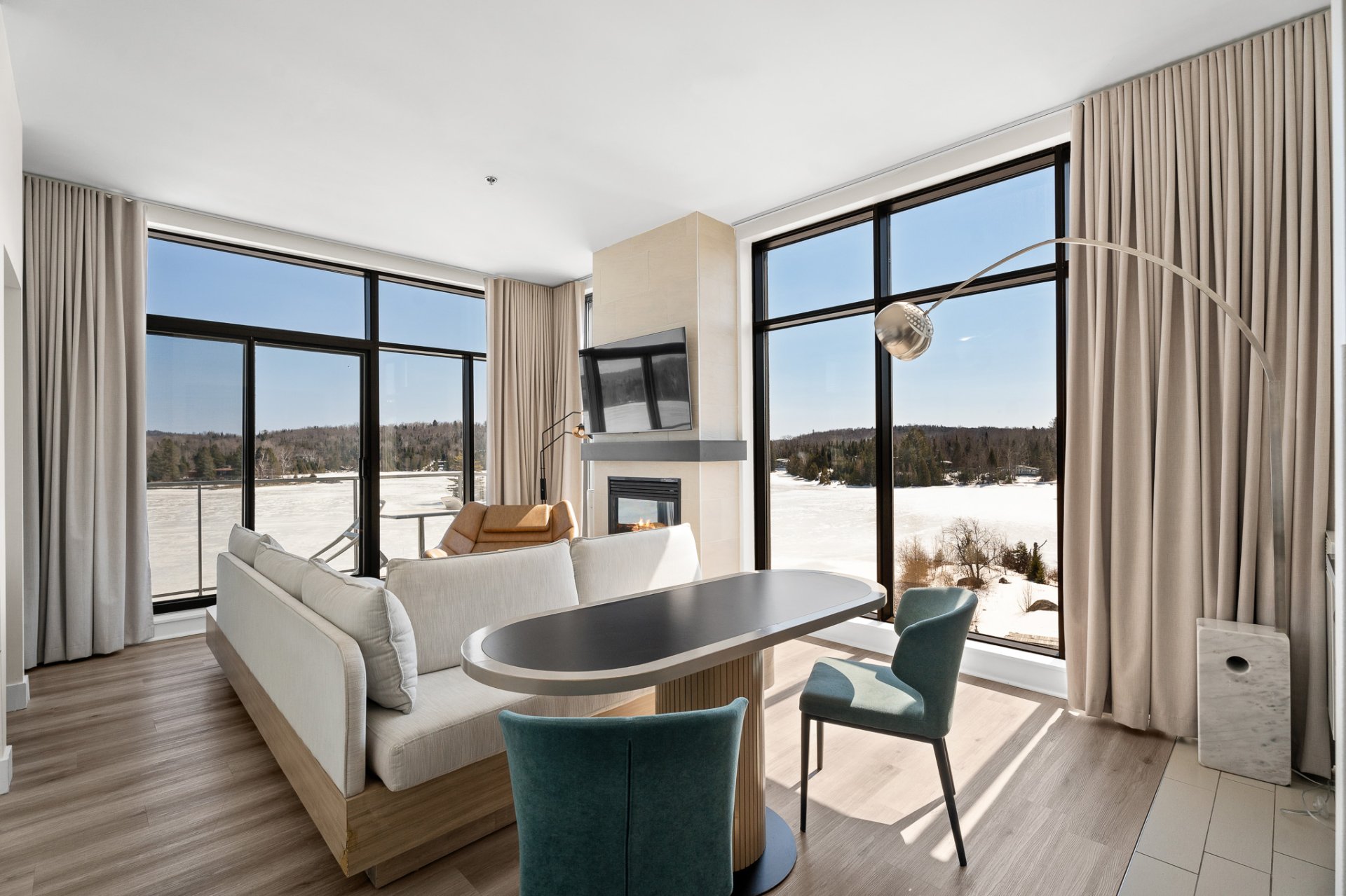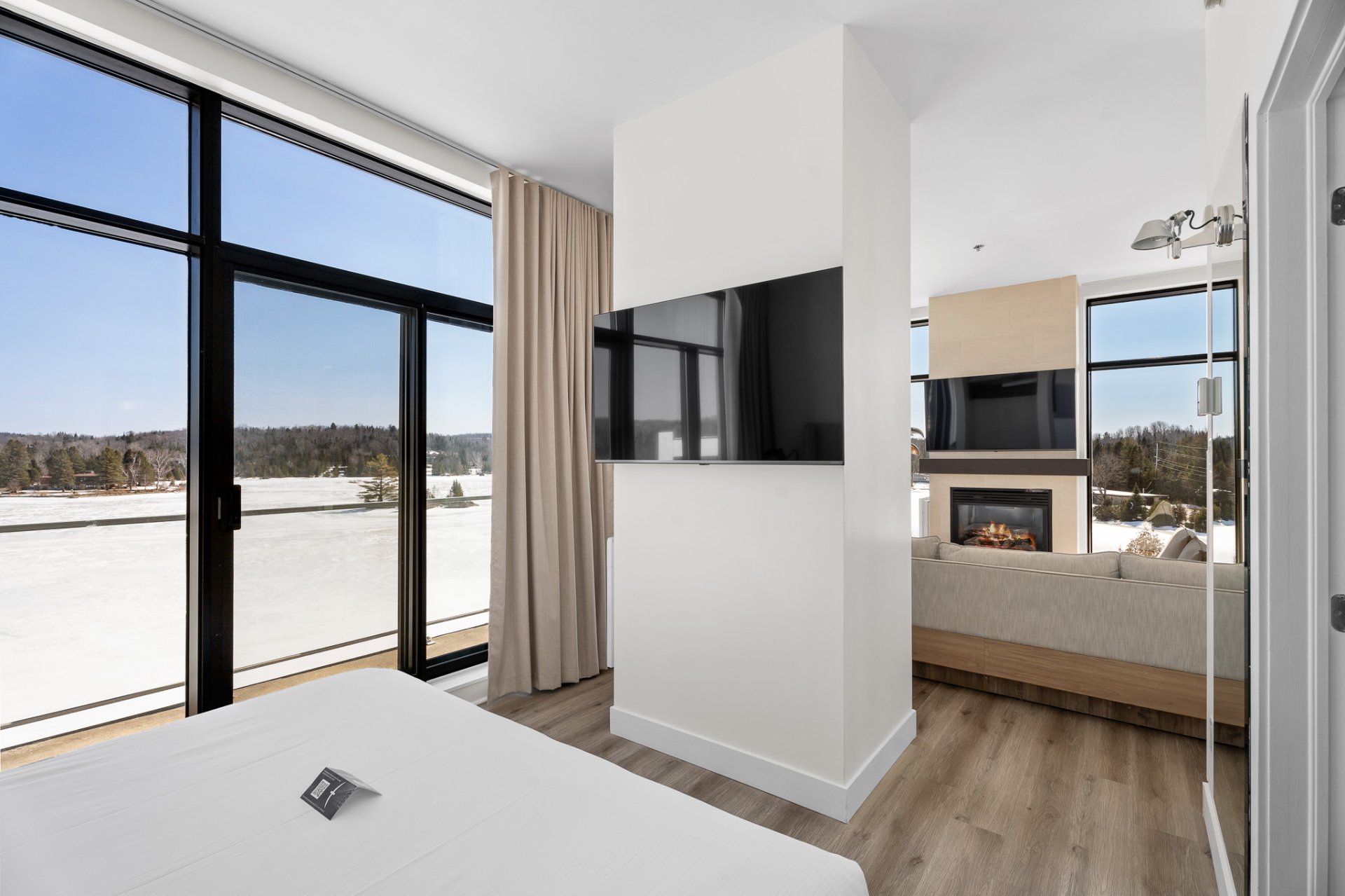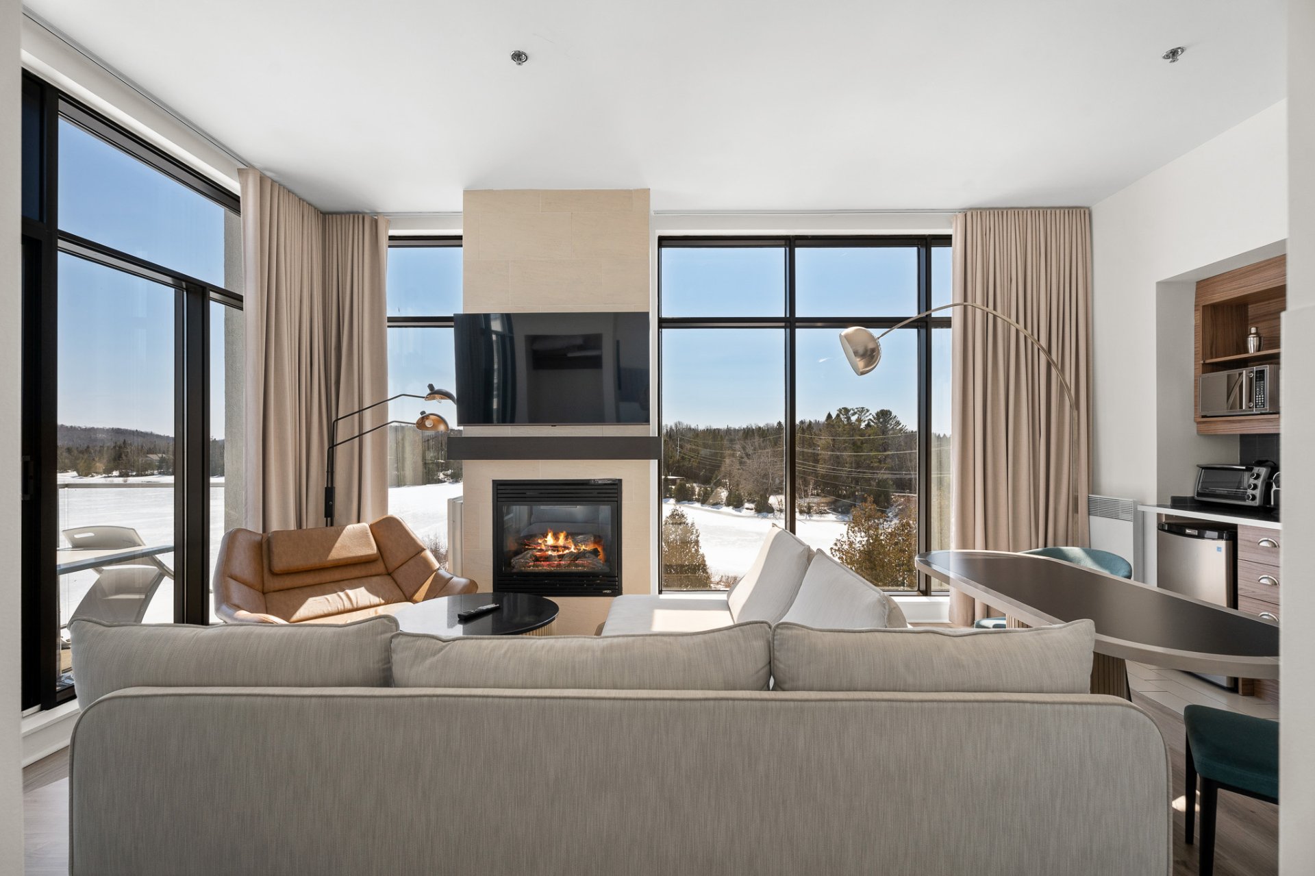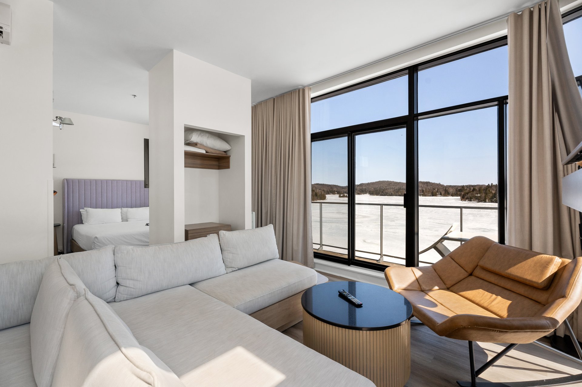Estérel Resort - Entre nature et confort, cette magnifique suite à aire ouverte vous invite à décrocher du quotidien. Bordée par deux lacs navigables, elle offre une chambre, un foyer au gaz double face créant une ambiance enveloppante, une grande salle de bains et une cuisinette pratique. Le balcon vitré dévoile une vue paisible sur l'eau, été comme hiver. Pouvant accueillir jusqu'à 4 personnes, vous profitez d'un accès complet aux installations : piscines, spas, gym et restaurants. Une propriété idéale pour relaxer ou investir dans un environnement d'exception. Revenus sur location via gestion hôtelière.