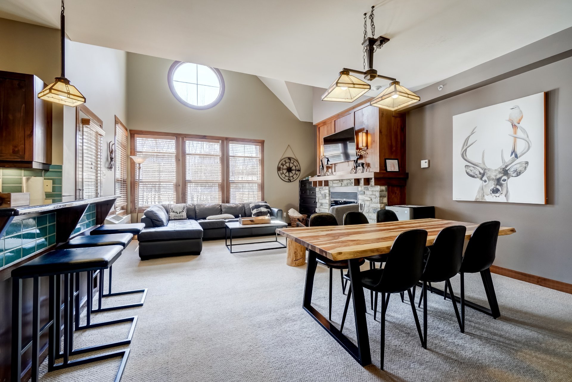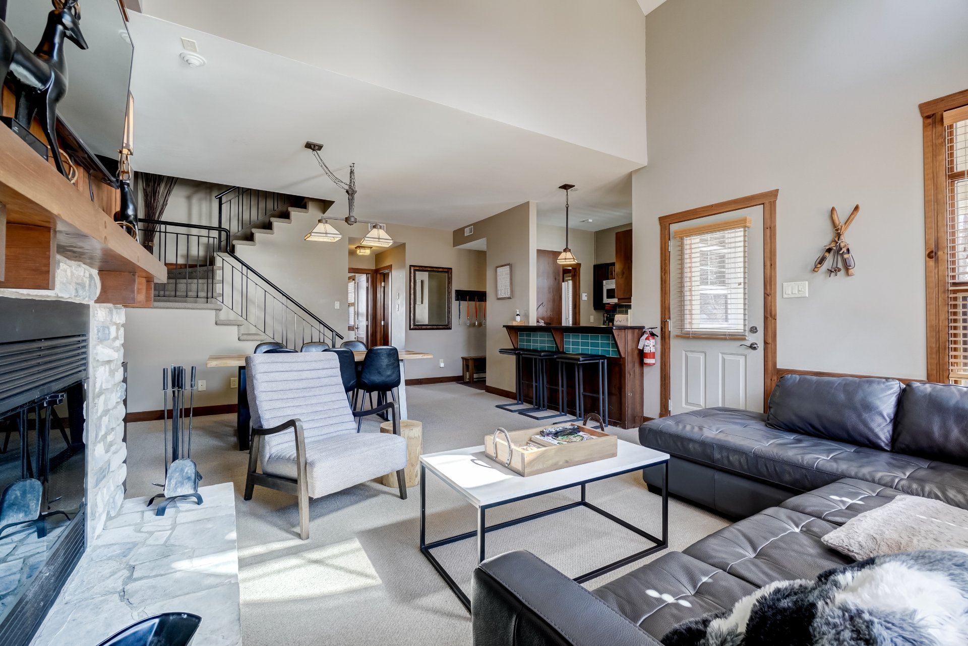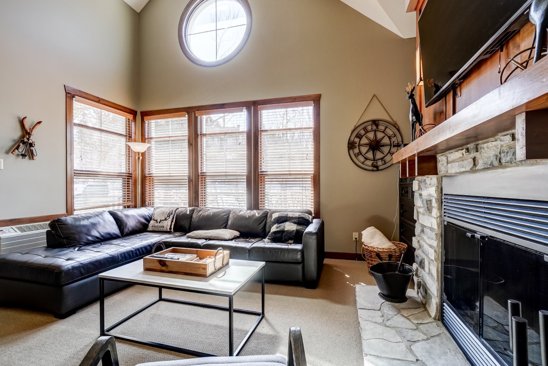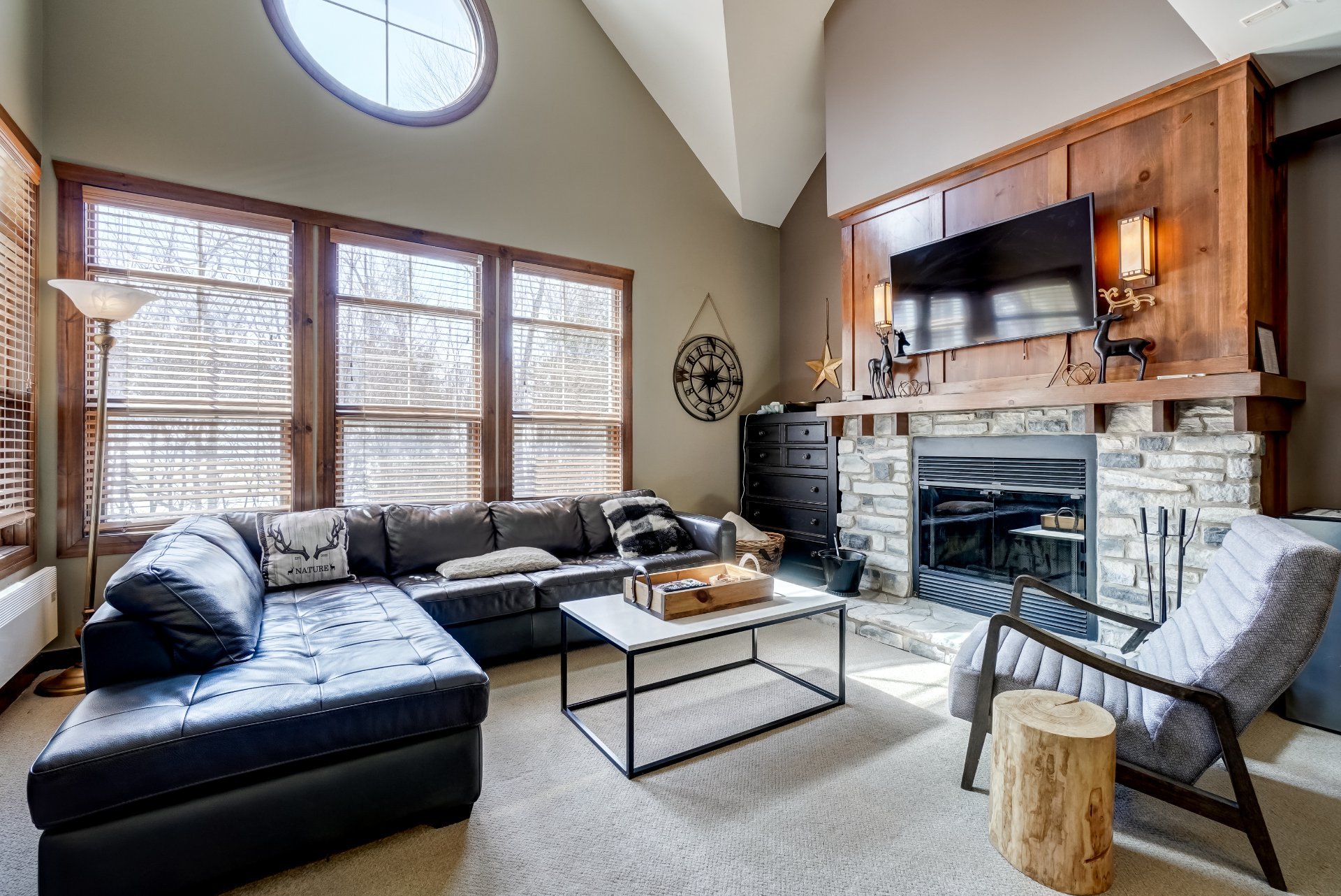 ** Tremblant-les-Eaux ** Condo au look contemporain sur 2 étages, vous offrant 2 chambres, foyer de pierre et boiseries, plafond cathédrale, cuisine équipée d'un comptoir lunch parfait pour les repas rapides, et salle à manger adjacente. Le balcon de bonne dimension est l'endroit parfait pour profiter du soleil et de l'air frais. Nichée à l'écart au 2e étage se trouve la chambre des maîtres et sa salle de bain attenante. Un espace de rangement, un stationnement et une vignette pour vos invités sont également inclus. Vous pouvez vous détendre dans l'un des deux spas, ou dans l'un des saunas, sec ou vapeur, situés au Clubhouse.